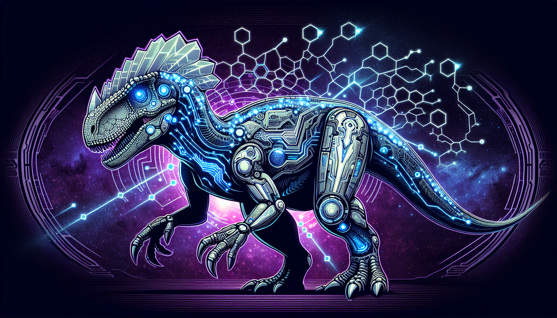 The Matrix Maiasaura features a neural web of quantum processors integrated throughout its nervous system, allowing it to create protective digital fields around itself and allies. Its augmented brain can process thousands of tactical scenarios per second while maintaining the species' natural protective instincts. The dinosaur's hide is enhanced with photoreactive scales that can generate holographic shields.