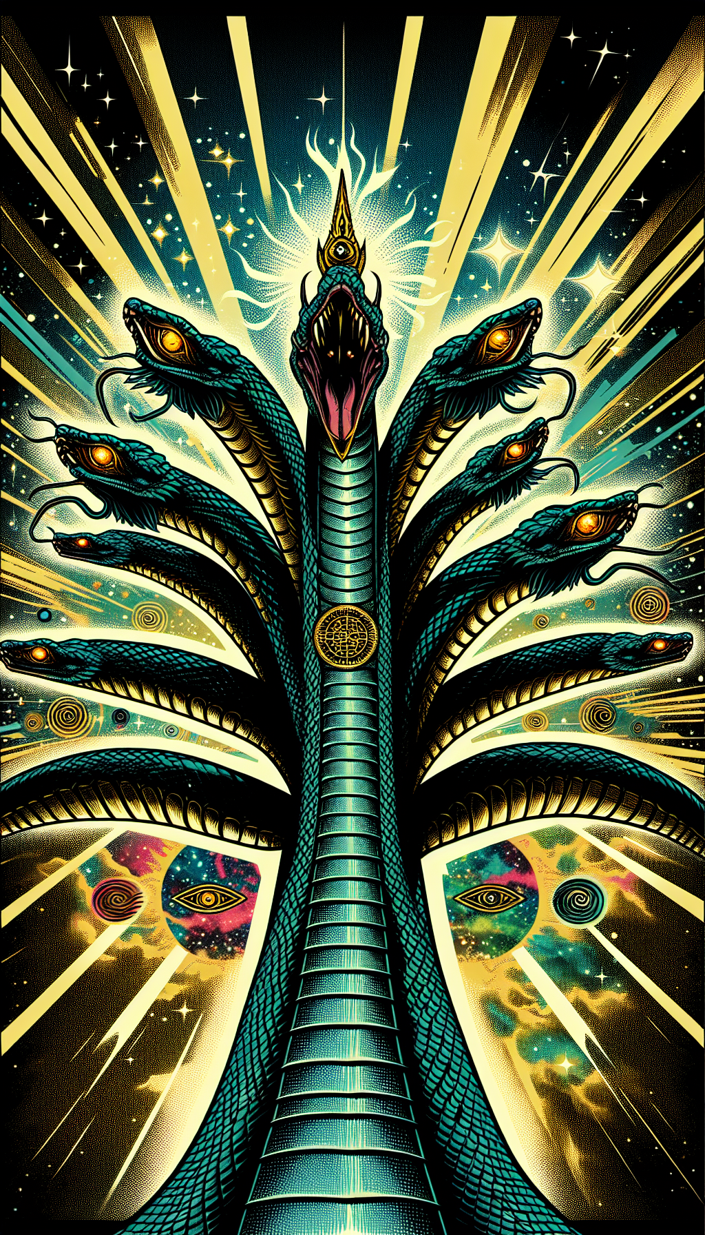 Born from the primordial waters before human civilization emerged, the Transcendent Naga originated as the first serpent deity whose consciousness fragmented across dimensions, manifesting in various forms throughout human mythology from the Hydra of Greece to the Rainbow Serpent of Australia. As humanity evolved, the Naga maintained its presence across cultural boundaries by shifting between serpentine and humanoid forms, preserving ancient knowledge and serving as the watchful guardian of the veil between the mortal realm and the cryptid dimension.