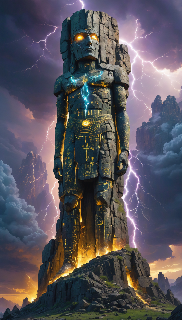 The Stonebound Colossus was born from the heart of the Great Plains' most ancient rock formations. Forged by the Thunderbird's electrifying presence and imbued with the wisdom of the earth, it emerged as a protector of sacred sites and a guide for the Earthbound Guardians.