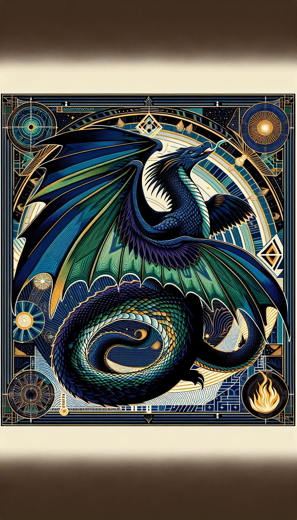 The Eternal Wyvern possesses scales that shimmer with an otherworldly glow, capable of reflecting the light of distant stars. Its eyes are said to hold the wisdom of ages, able to see through the veil of time and space. The creature's wings, vast and powerful, can create gusts that stir the very fabric of reality. Its breath is a mix of fire and shadow, capable of both destruction and illumination.