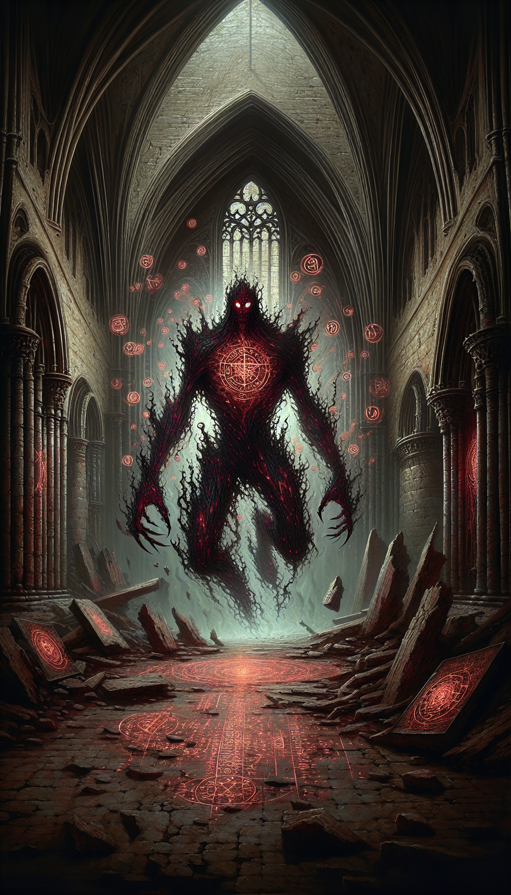 The Rune Devourer is a semi-corporeal entity composed of swirling, shadowy energy infused with fragments of consumed runes. It possesses the ability to absorb and manipulate arcane symbols, using their power to enhance its own abilities. The entity is nearly impervious to physical attacks but can be weakened by sacred rituals and protective wards.