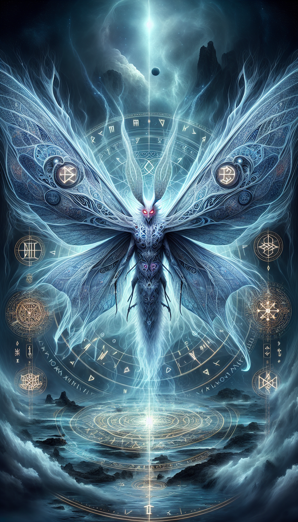 Originated from an ancient Viking ritual where runes were carved into a Mothman statue during a lunar eclipse. The cryptid's spirit merged with the runic magic, creating a being that could see through time and space. Sigrid the Wise discovered this entity during her studies of ancient Norse rituals and recognized its potential to aid in the Kraken hunt.