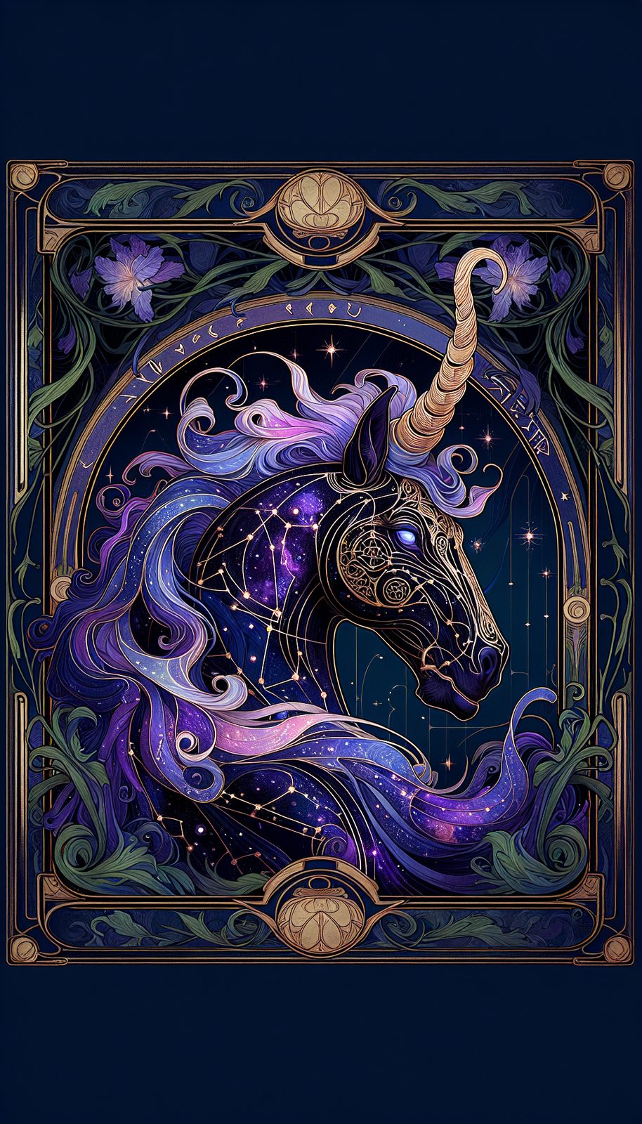 Can phase between dimensions at will. Its spiraled horn contains compressed cryptid knowledge. Leaves shimmering void-trails when moving between realms. Eyes display shifting star patterns that reflect observed cryptids.