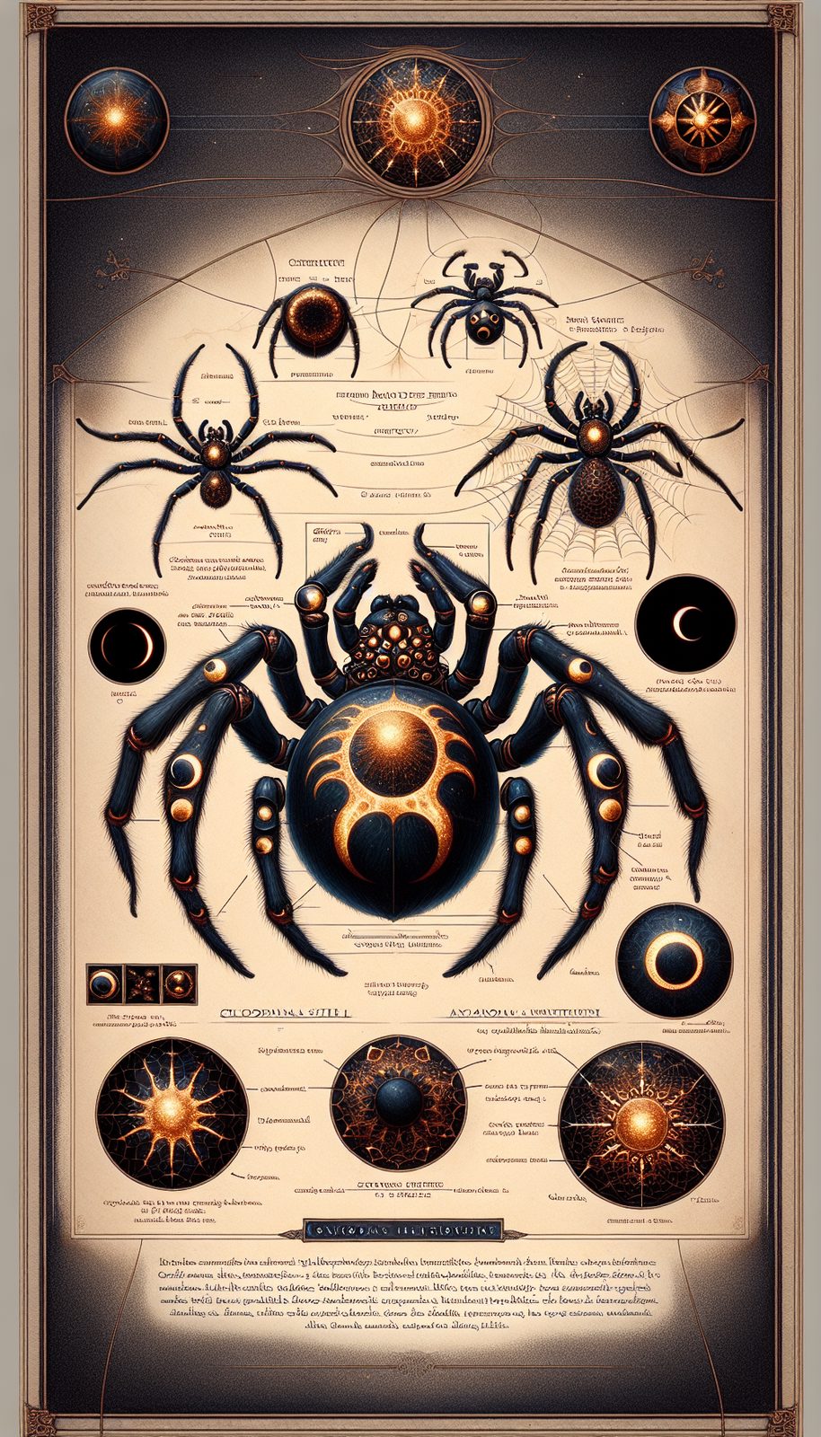 Bioluminescent markings that pulse with eclipse phases, eight eyes that reflect different cryptid habitats, web strands containing encrypted cryptid knowledge