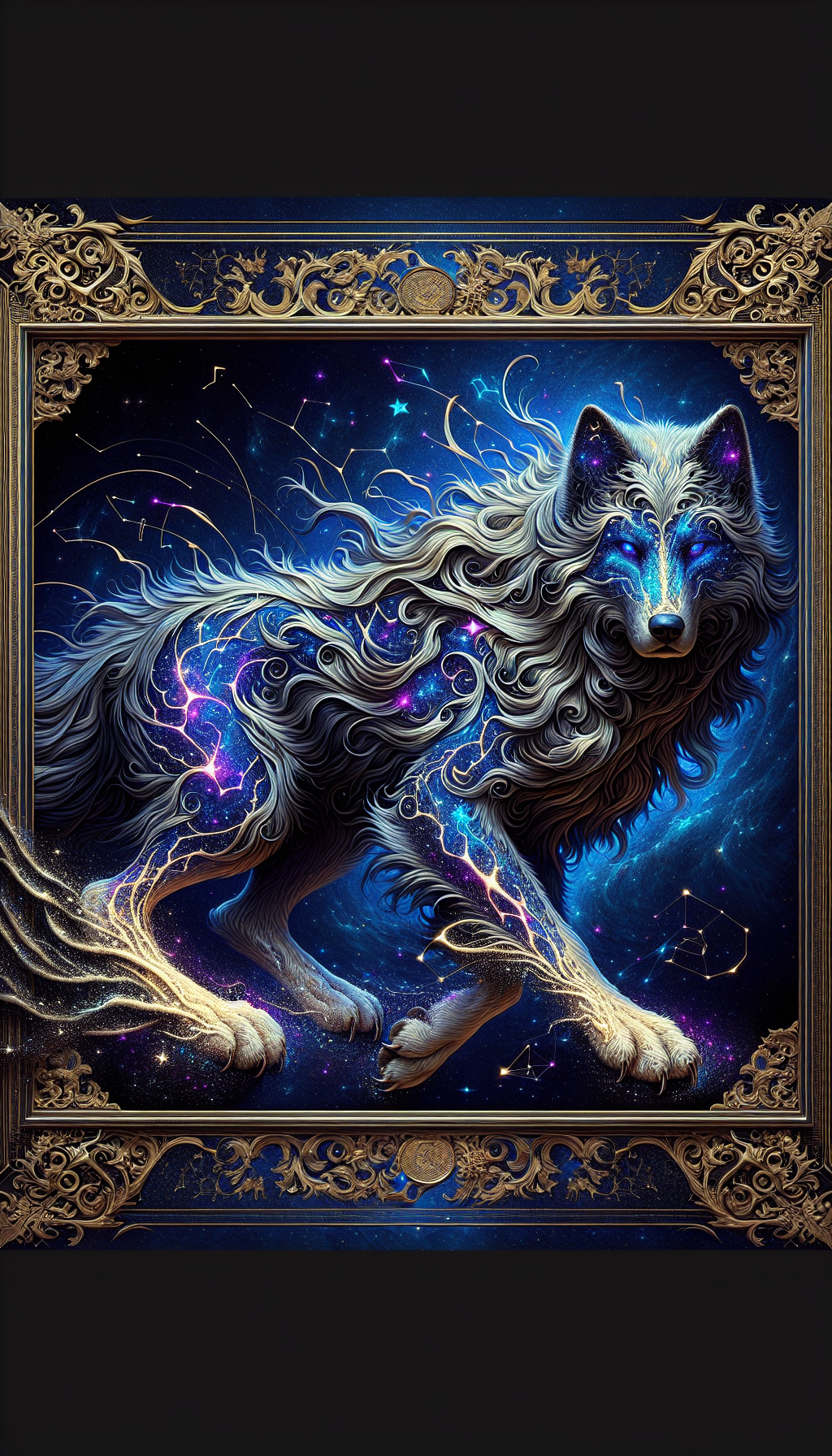 Constellations form its fur patterns, leaves star trails when moving, eyes contain swirling galaxies, can phase between celestial and terrestrial realms