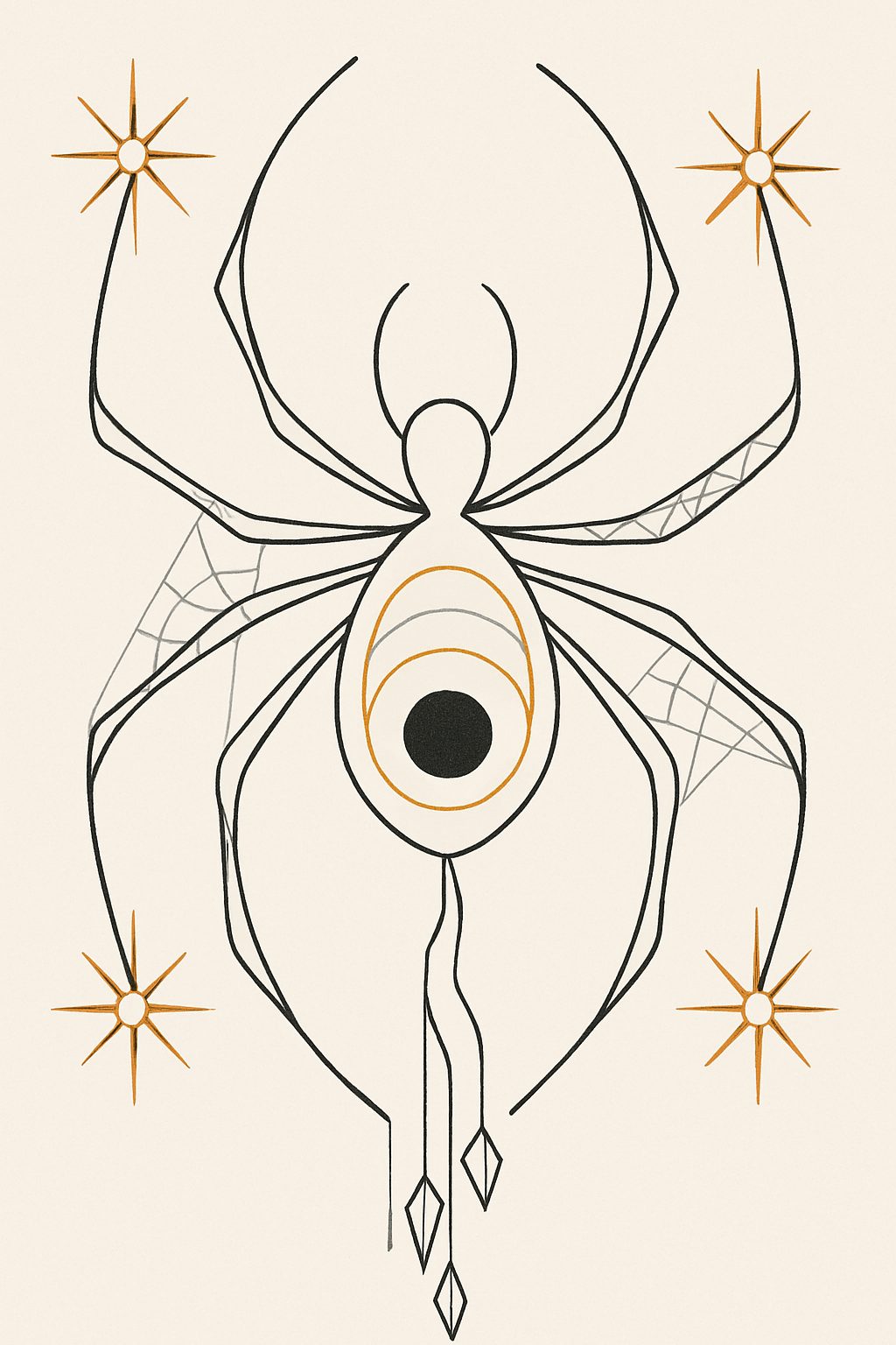 A primordial spider deity trapped between sun and shadow during the cosmic creation event, now binding cryptid realms through eclipse cycles it spins into existence