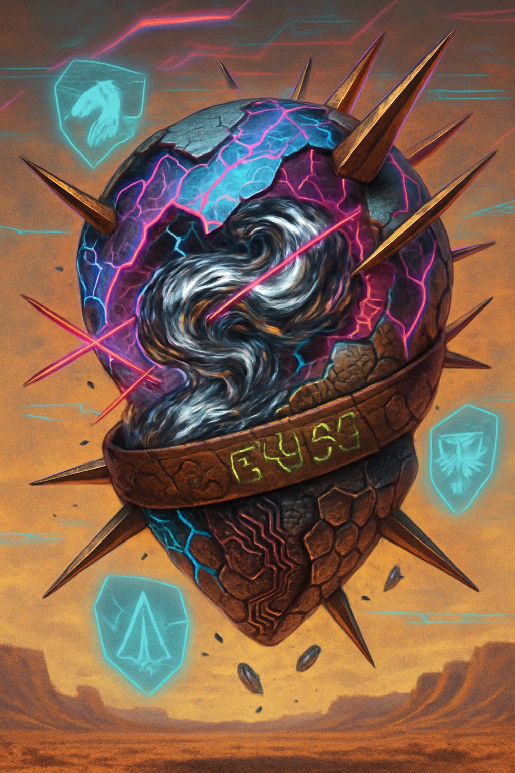 Liquid mercury-like alloy surface shifts between faction color schemes, embedded with neural interface spikes and projecting holograms of conflicting faction emblems. Constantly reforms itself to prevent decryption.