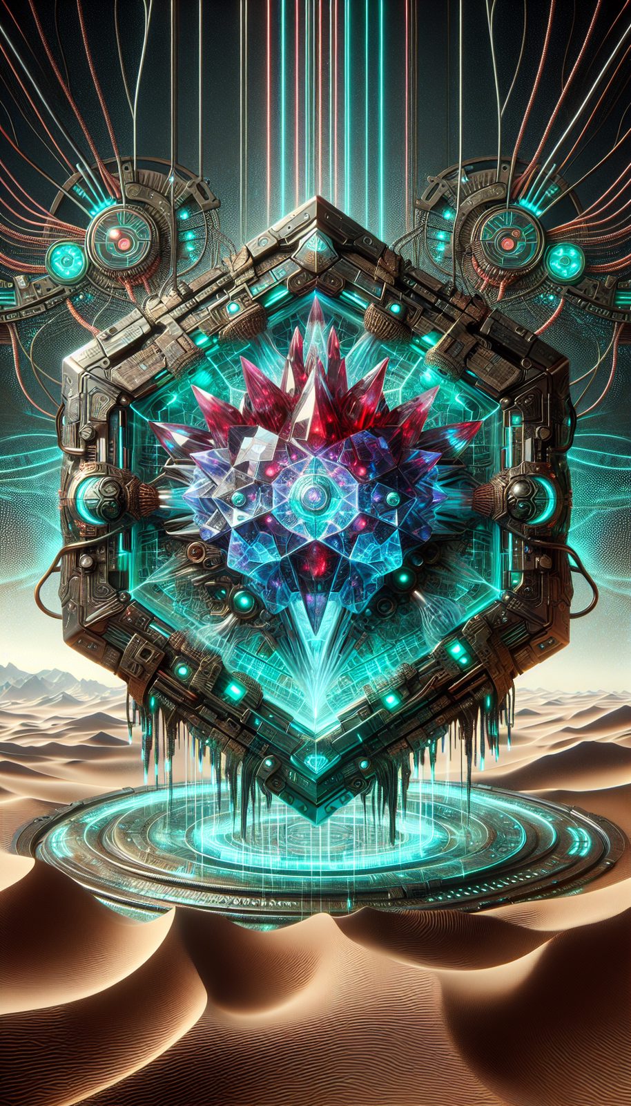 Morphing crystalline core with faction-color shards, neural ports from multiple tech generations, and an energy field that distorts nearby gear. Glowing fractal patterns cycle through league insignias when activated