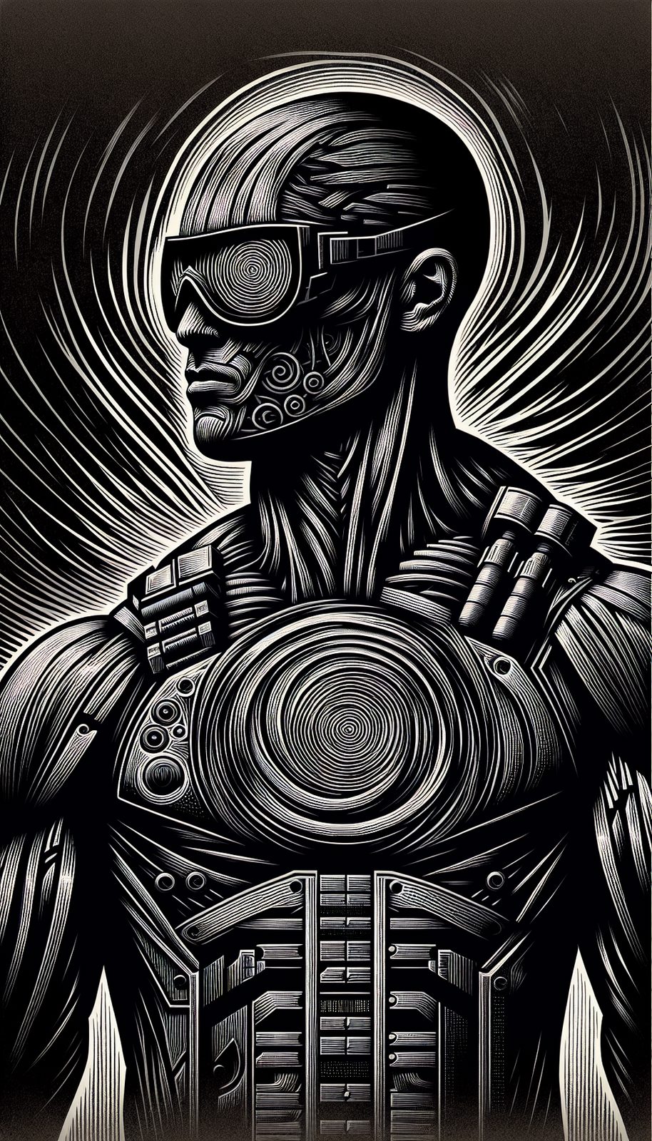 Subsonic pulse generator embedded in chest plate, retractable frequency blades vibrating at 200Hz, vocal distortion modulator capable of shattering concrete