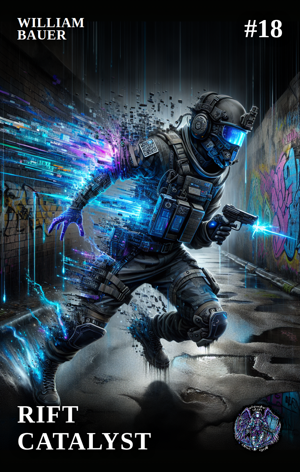Originally a black ops infiltration specialist, the operative was exposed to prototype phase-shift technology during a failed mission into AI-controlled territory. The unstable energy fused with their neural implants, transforming them into a living conduit between dimensions. Now they exist partially across multiple realities, hunted by all factions for the dangerous knowledge in their fractured mind.
