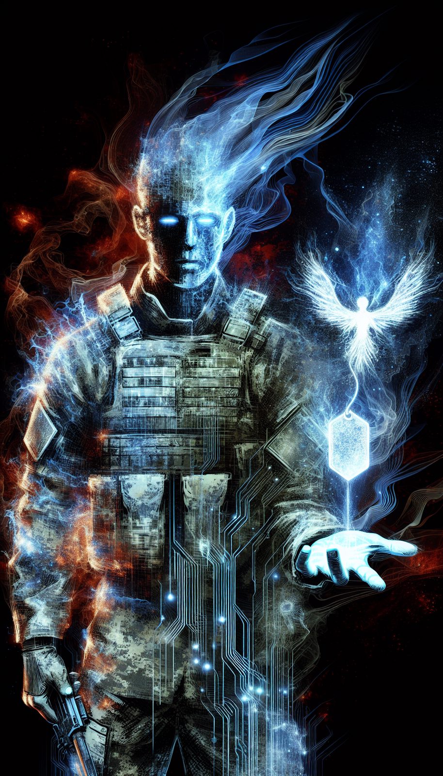 Exists as a semi-corporeal energy form that can phase between digital and physical realms. Wields prototype photon blades that disrupt neural interfaces and leave no physical wounds. Its presence causes temporary system glitches in augmented soldiers and leaves behind cryptic data fragments as evidence of its investigations.