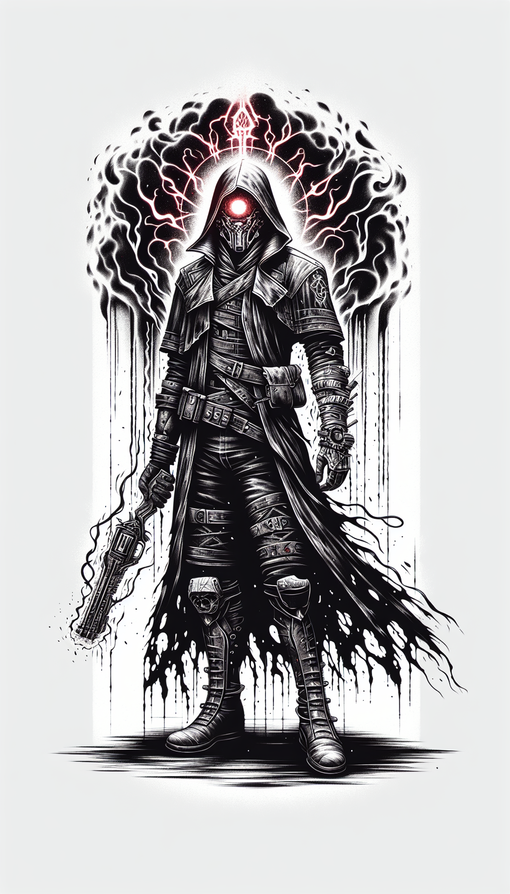 Blood-cured leather armor with glowing oath scars, retractable wrist garrotes, bulletproof duster with weapon compartments, vibro-spike heeled boots that leave permanent scorch marks