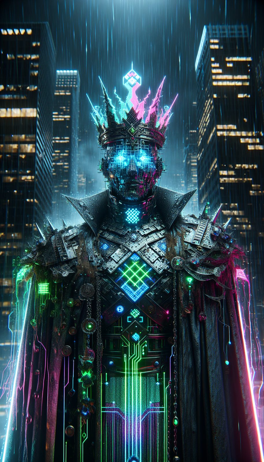 Glowing chainmail forged from melted faction emblems, self-repairing composite armor showing all league colors, voice modulator projecting commanders' stolen vocal patterns