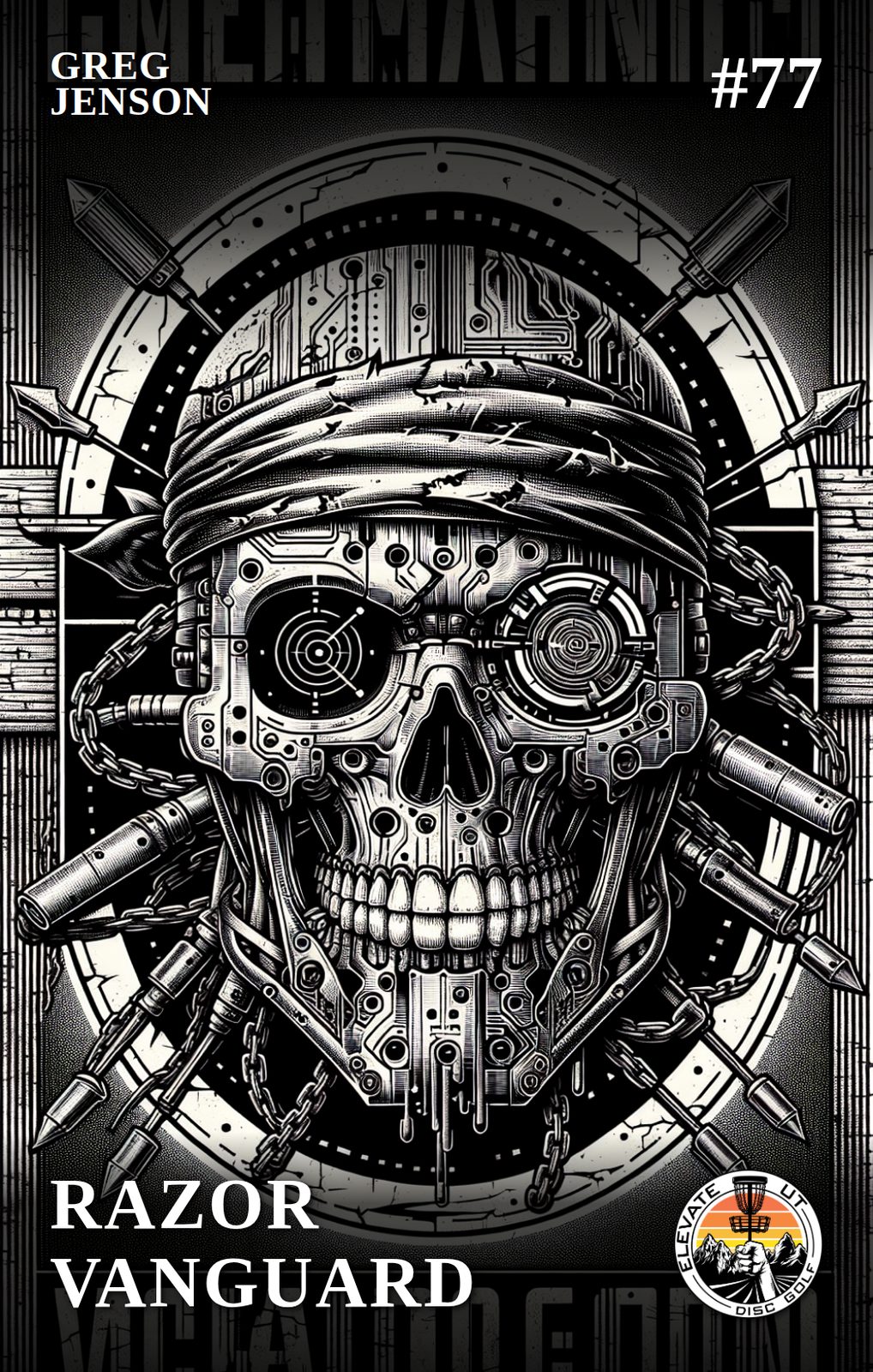 Matte-black alloy plate with glowing crimson circuitry, razor-edged disc charger port, holographic battle damage counter, and hidden compartments containing shards of faction insignia