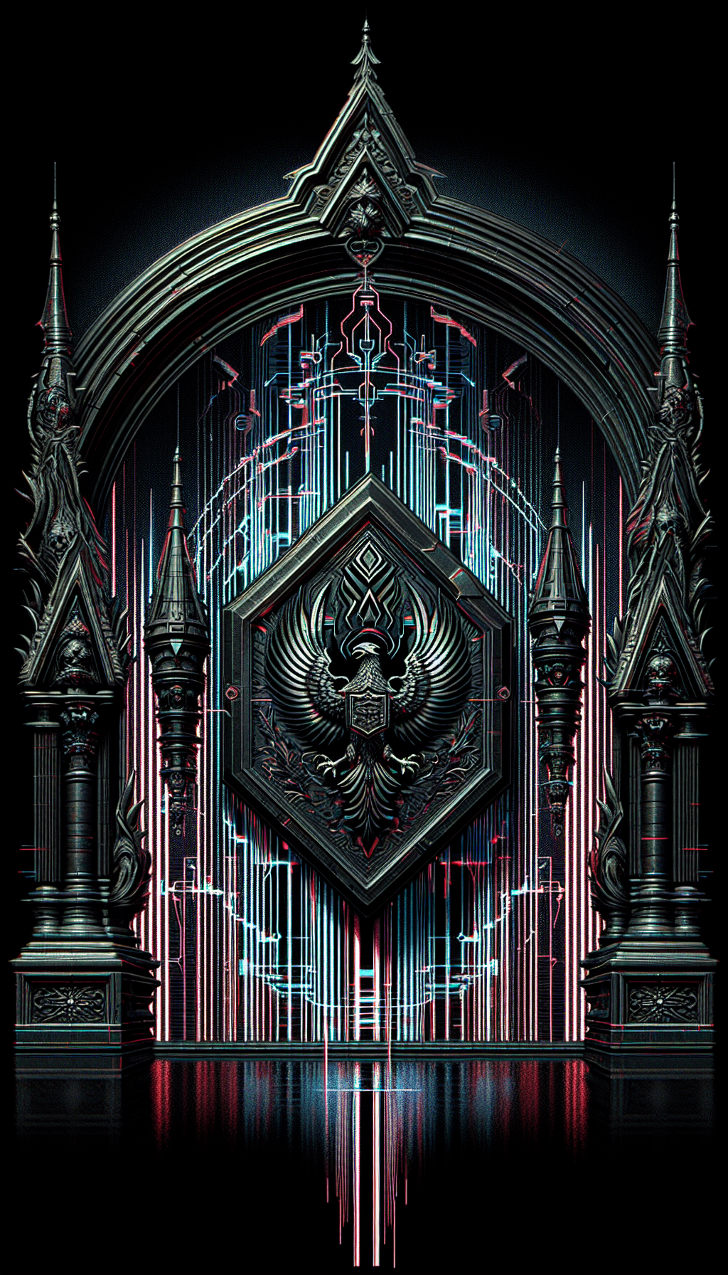 Matte black nano-carbon frame with liquid circuitry pulsations, holographic crown projection, and neural spike emitters that override nearby augmented systems. Emits crimson energy waves when asserting control over faction tech.