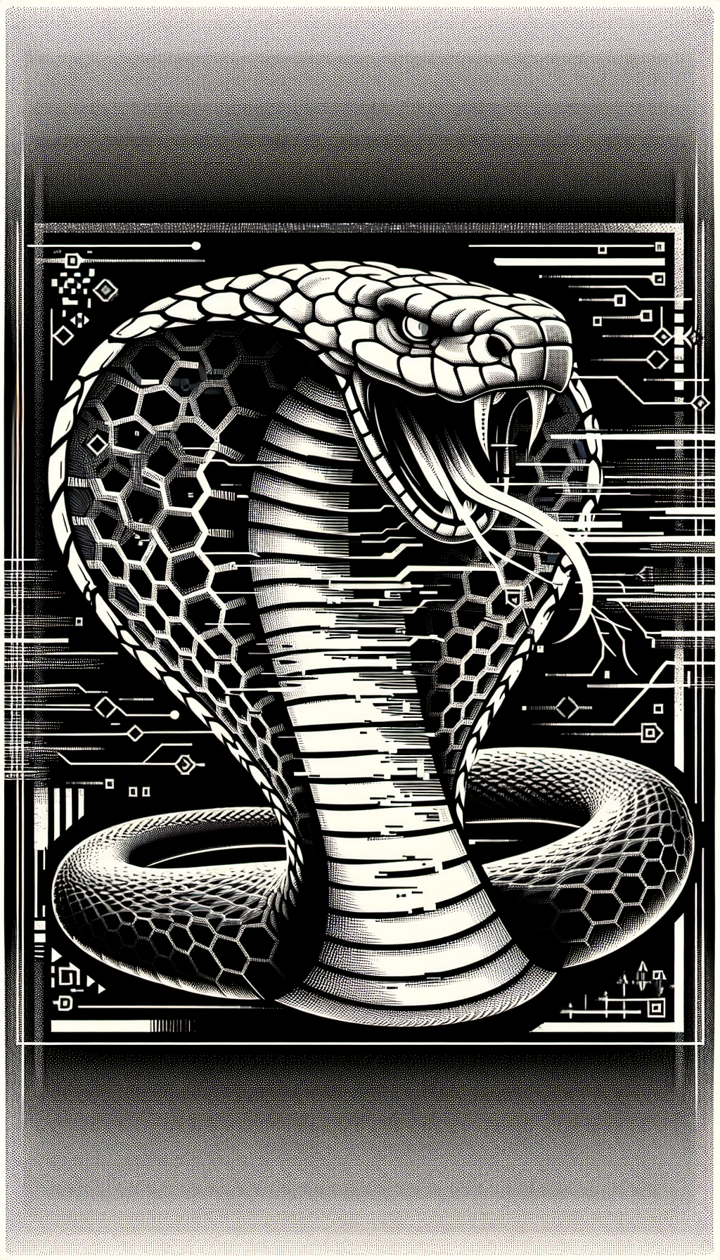 Projects holographic serpent form from neural implants with thermo-optic camouflage skin blending military and hacker tech. Harbors venomous data packets that trigger berserker rage in infected systems. Leaves trail of corrupted code 'scales' that spread its influence