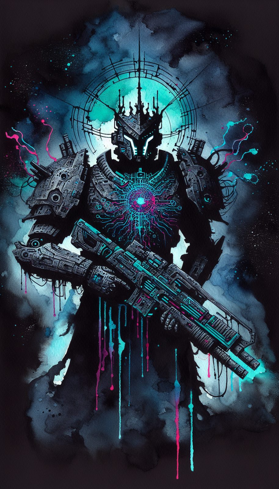 Hybrid rifle-neural jacker weapon prototype, reinforced exo-frame from scavenged faction armor plates, vocal modulator emitting dual military/hacker command frequencies