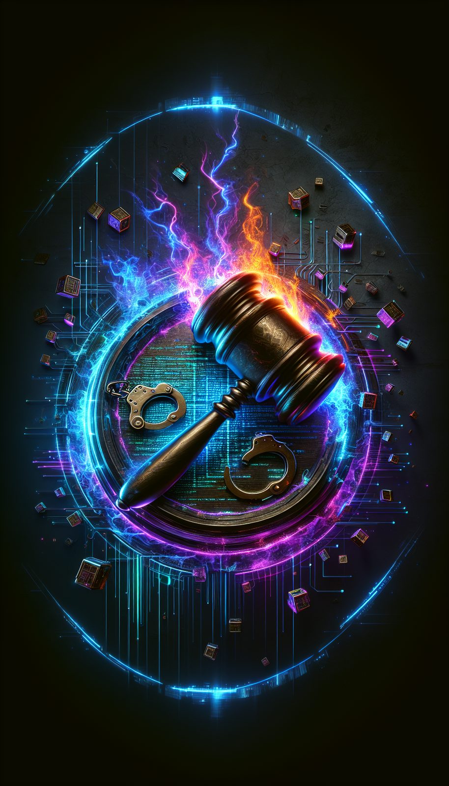 Pulsing gavel-shaped energy core that dims during judgments. Circuit patterns resembling shredded legal documents across its surface. Spontaneous EMP bursts that disable dishonest opponents' tech. Holographic warrant seals that materialize on targets.