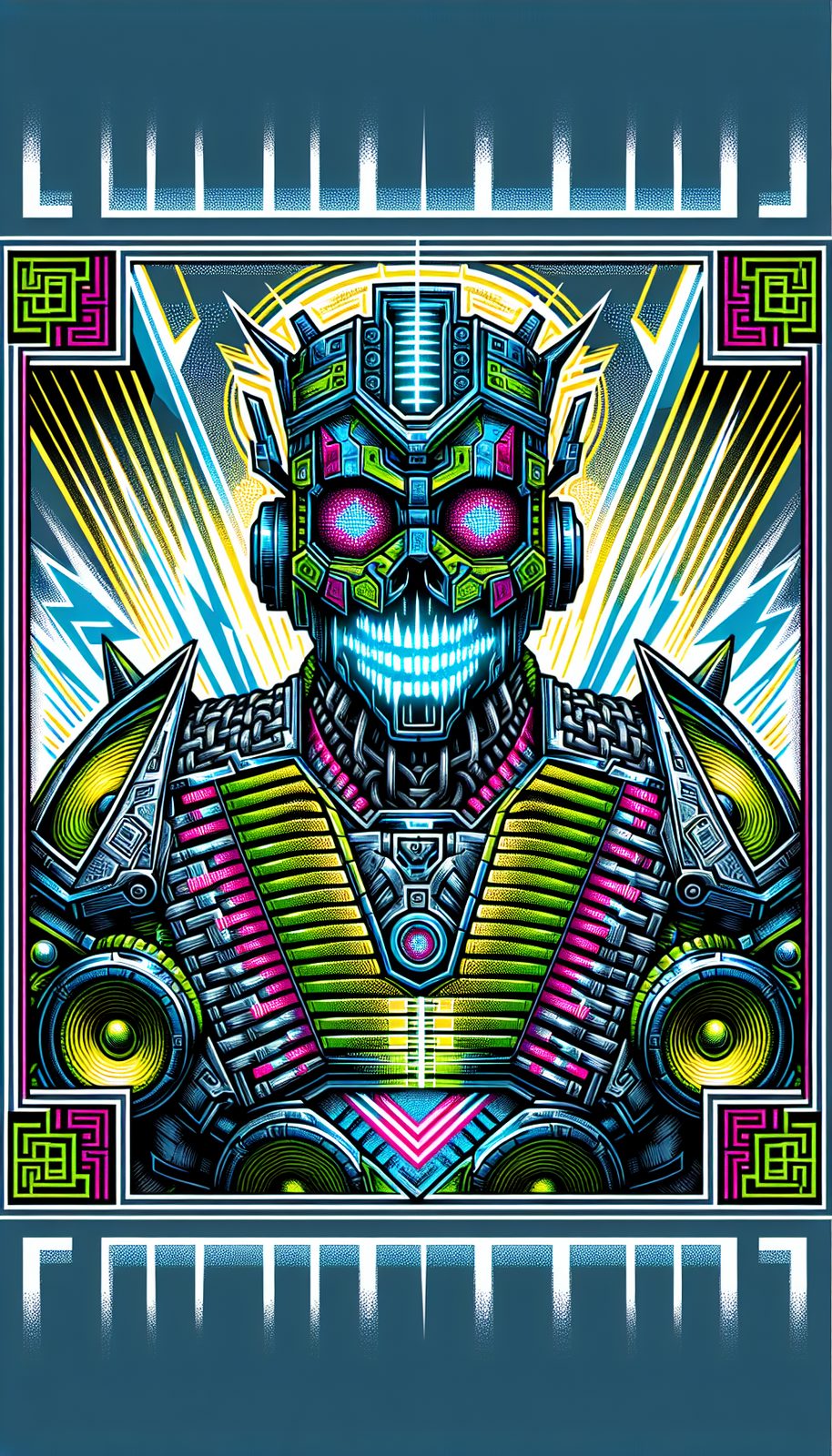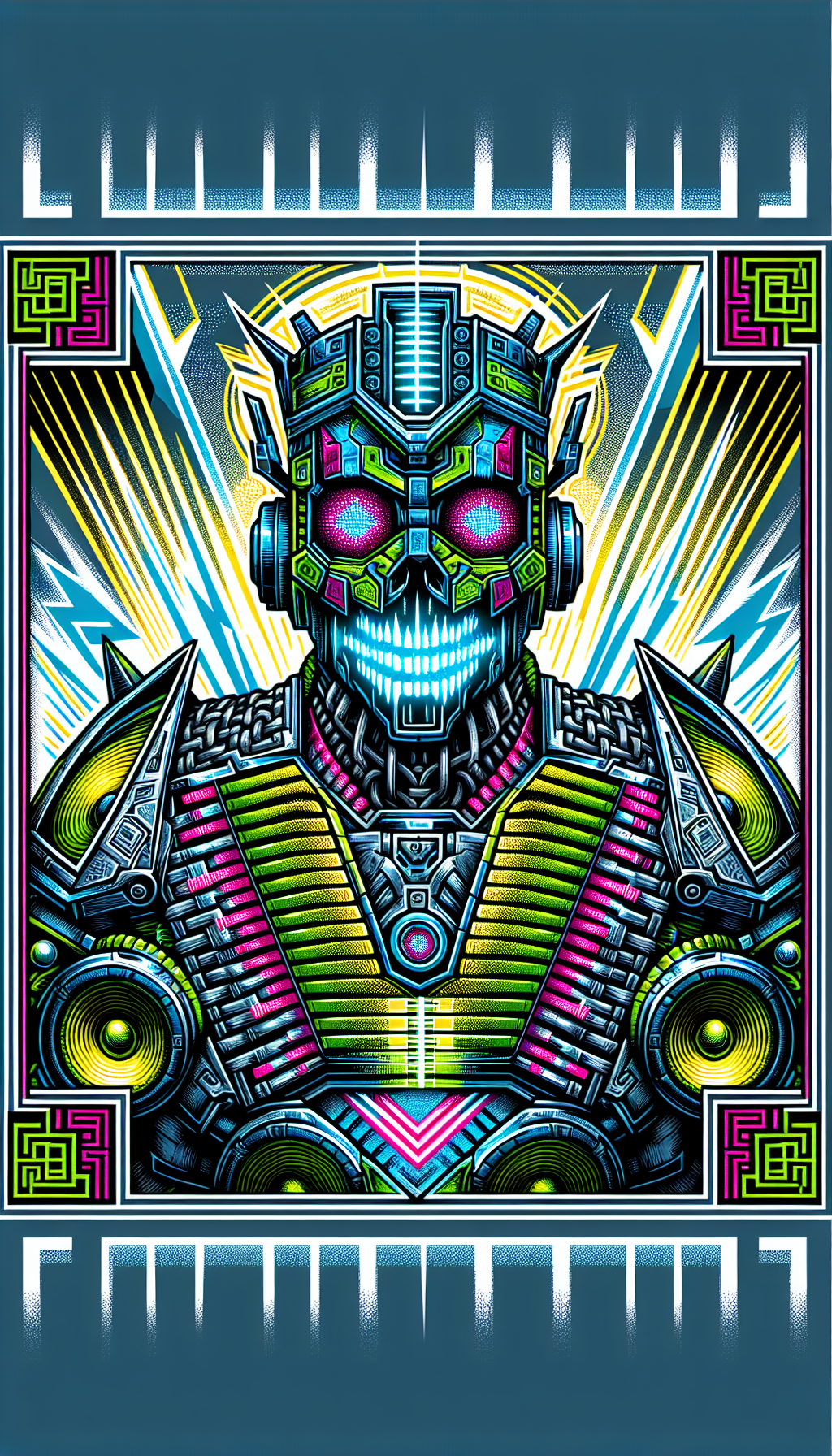 Pulsing neon-blue vocal coil emitters capable of shattering concrete, sharktooth-patterned frequency dampeners along the torso, retro-styled equalizer display visor that analyzes structural weak points, glowing subwoofer pauldrons generating infrasonic tremors