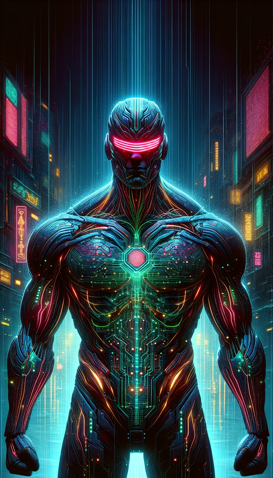 Neon-Soaked Justice Enforcer with Holographic Armor