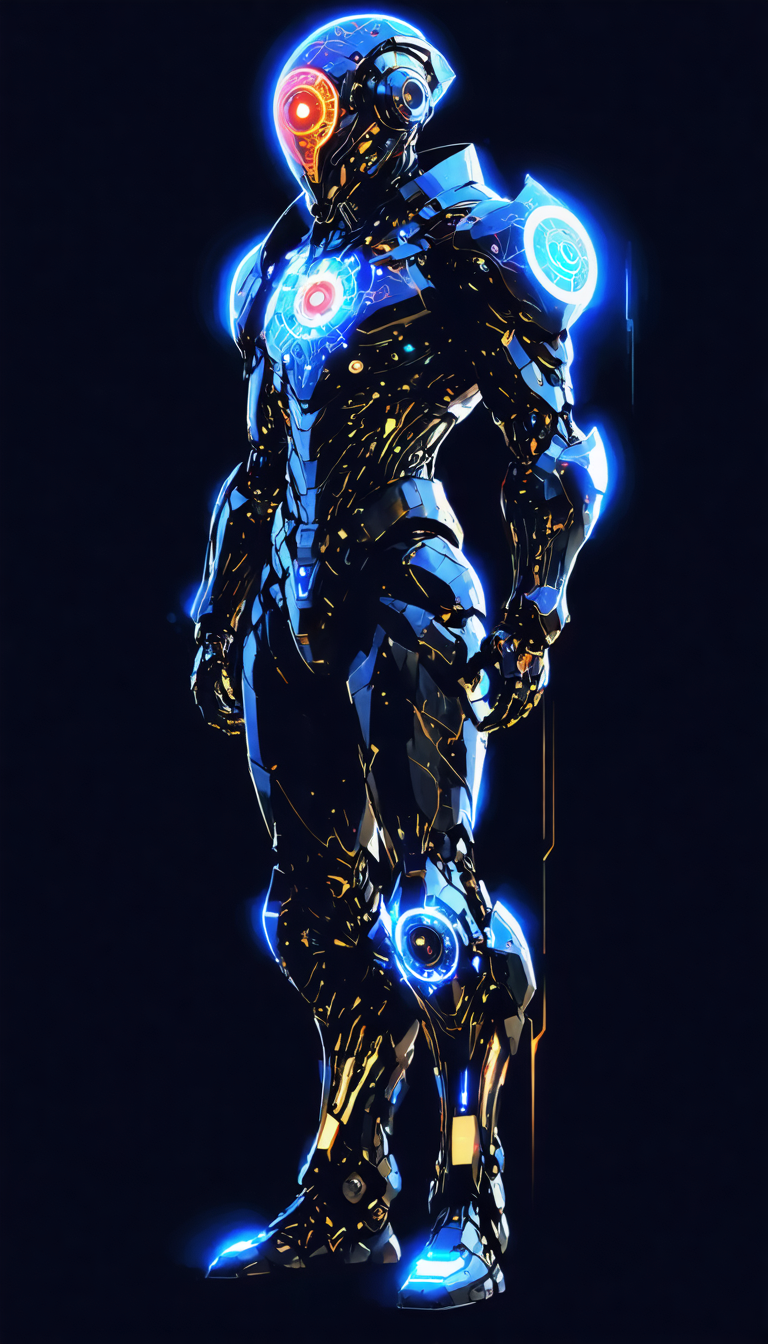 Black composite armor with pulsating orange energy veins, prismatic threat-assessment visor, and exposed neon-blue reactor core containing unstable phase energy. Continuously emits low-frequency hum that disrupts unshielded electronics.
