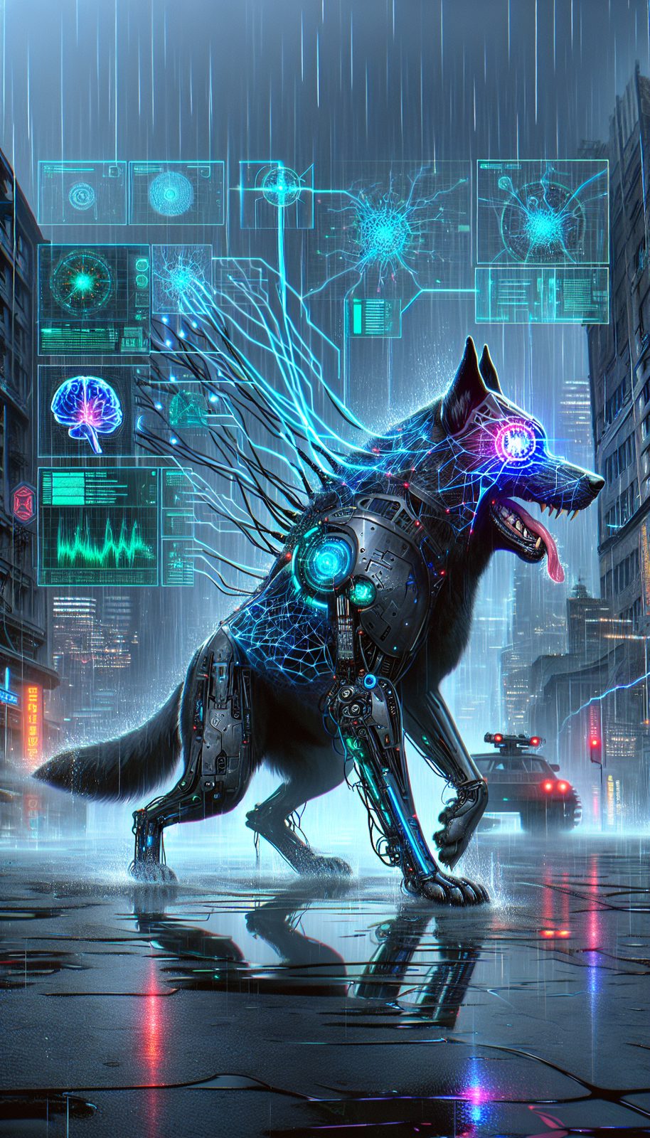 Neural interface implants syncing handler and hound, armor-piercing titanium fangs, adaptive camouflage fur shifting with environment, enhanced olfactory sensors tracking targets across kilometers.