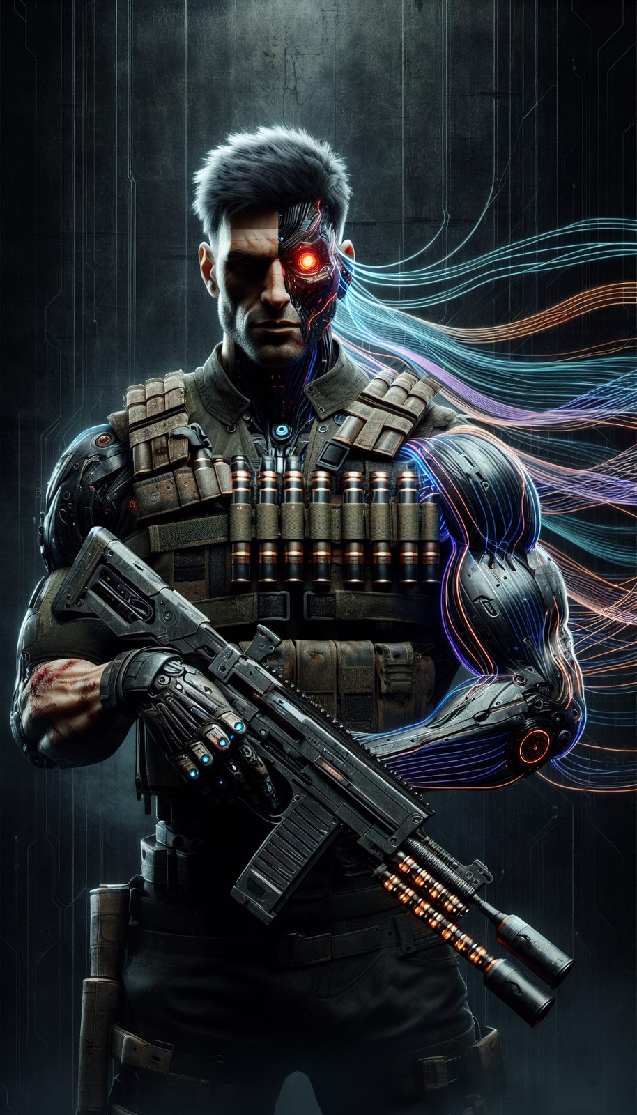 Shoulder-mounted micro-missile launcher, nitro-injector spinal implant boosting speed/strength, holographic decoy projector, vibro-shock knuckle dusters for close combat