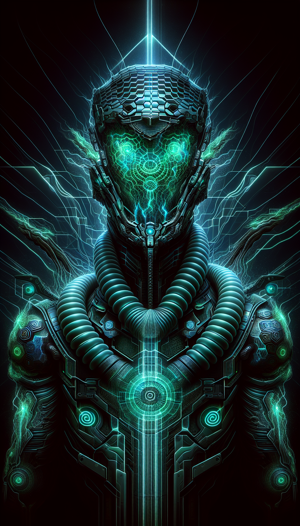 Bioluminescent scale-patterned bodysuit phases between dimensions, wrist-mounted temporal disruptor ages targets on contact, AI-corrupted targeting visor displays reality trajectories, serpentine cyber-tail delivers molecular-disrupting stings