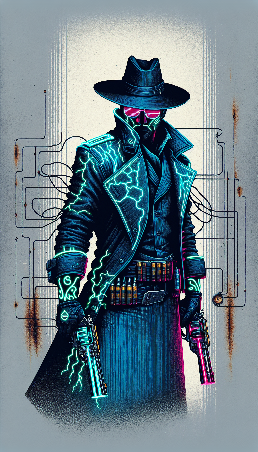 Equipped with twin plasma revolvers that pulse with electric blue energy, their quickdraw holsters are integrated with targeting systems salvaged from military drones. The weapons can fire both lethal plasma bolts and non-lethal stunning charges, making them perfect for negotiation enforcement. Their gear includes a weathered leather duster lined with energy-conducting fibers that create cascading neon patterns when the weapons are drawn, serving as both intimidation display and power regulation system.