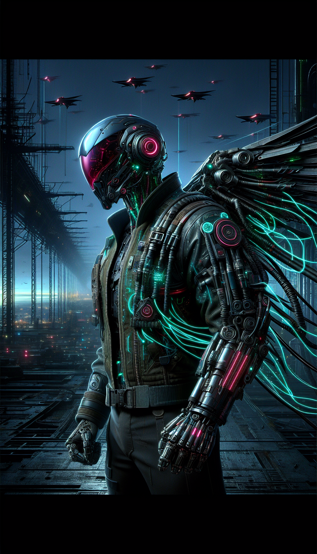 Cybernetic hawk-eye visor with thermal tracking, retractable carbon-fiber wing harness for urban gliding, wrist-mounted sonic disruptors, and spinal neural interface ports enabling real-time threat analysis and rapid combat responses.