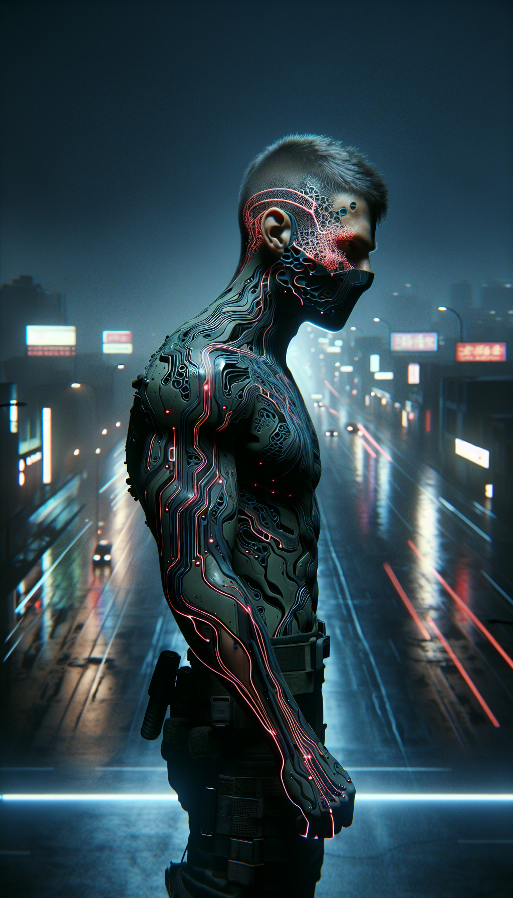 Neural interface ports pulse crimson when accessing networks, retractable monomolecular forearm blades etched with data-stream patterns, holographic bandana projecting shifting identity masks, phase-shift boots leaving temporary neon afterimages during movement.