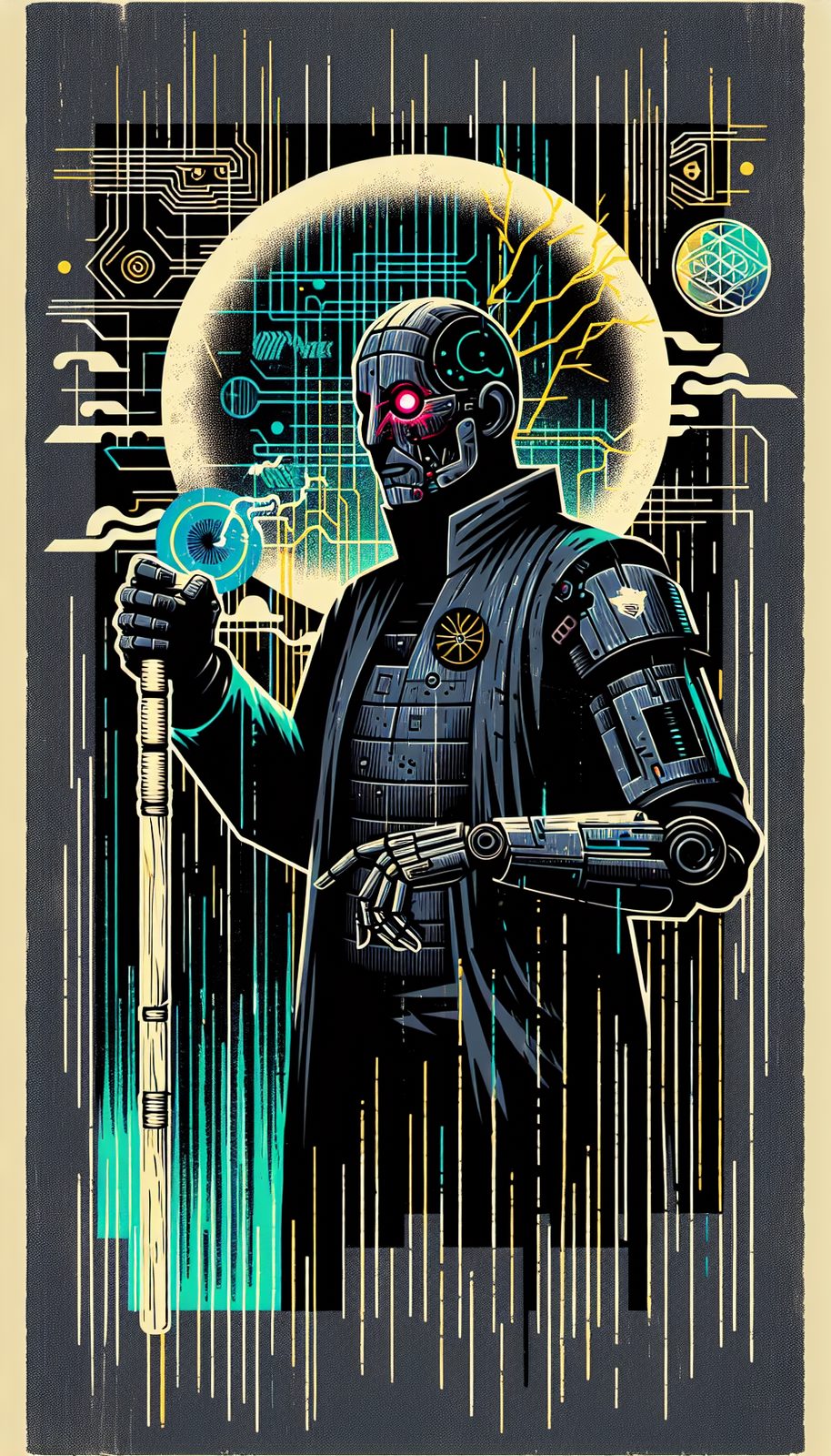 Wears an armored trench coat lined with stolen energy-dispersion tech. His cybernetic left hand houses micro-missile launchers, while a signature electrified cane conceals a monomolecular blade. A holographic monocle projects targeting data and creates shimmering decoys during escapes.