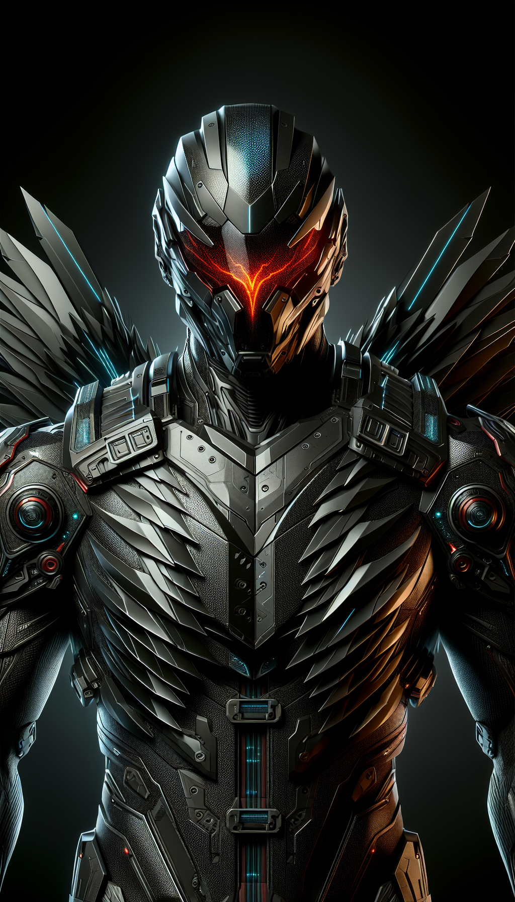 Armored flight suit with kinetic-dampening polymer plates, holographic HUD visor synced to neural implants, and stabilizer jets enabling short aerial maneuvers. Retractable wing-blades extend from forearms for close combat.