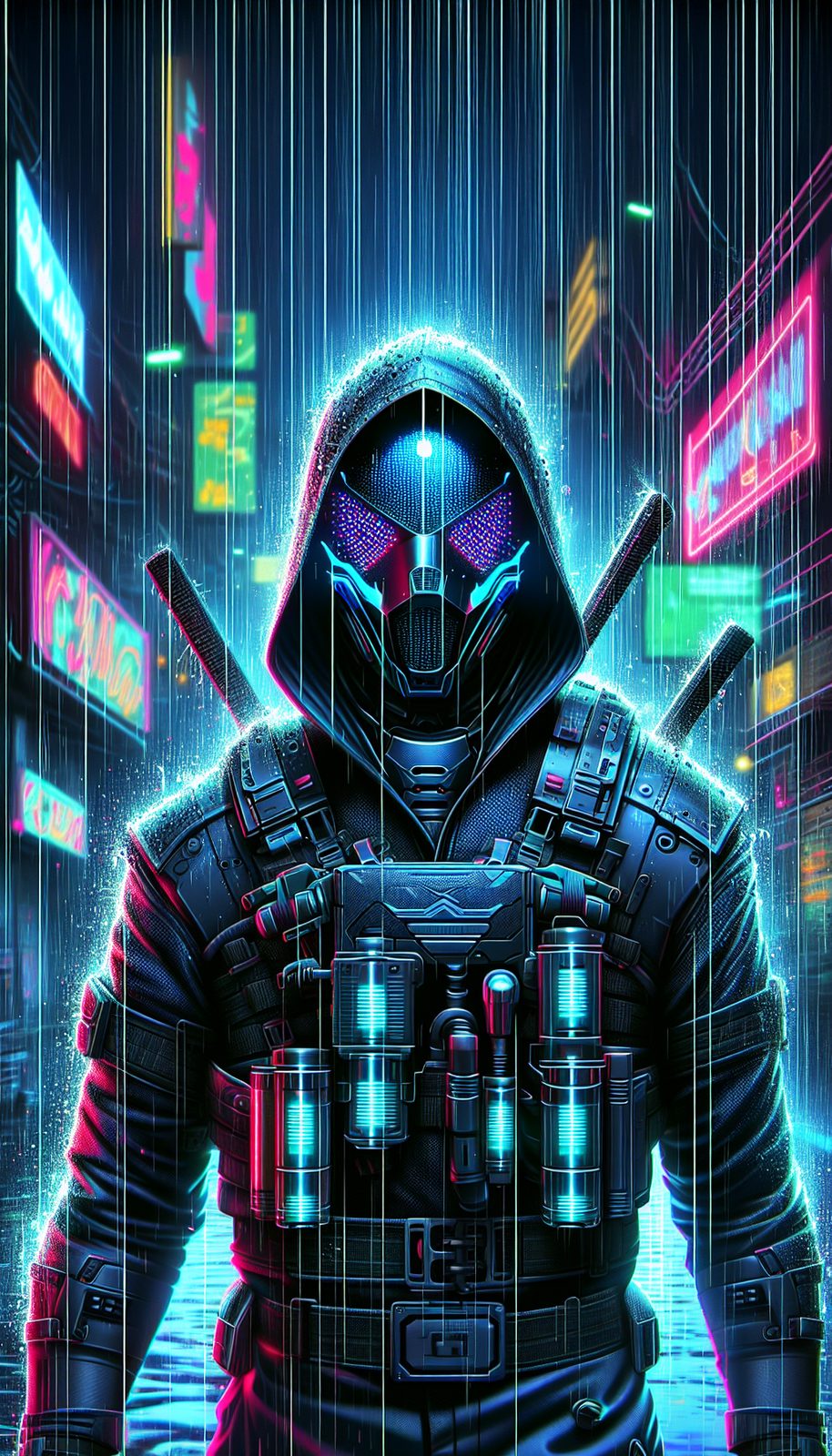 Wears photon-absorbing cloaking tech that refracts neon lights, retractable wrist-mounted monomolecular blades capable of slicing armored plating, and augmented ocular implants with multi-spectrum targeting