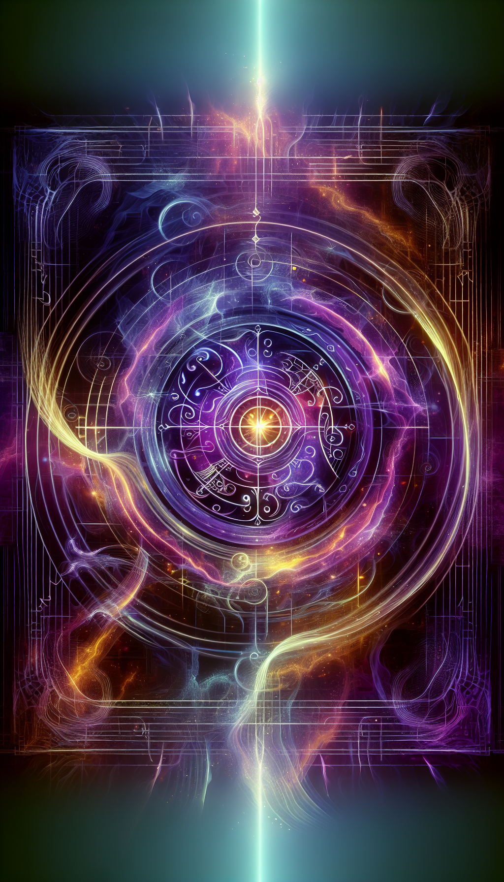 Pulsing concentric glyph rings emit visible soundwaves, chromatic aura shifts match dominant realm energy, fractal resonance patterns pulse in core sigil