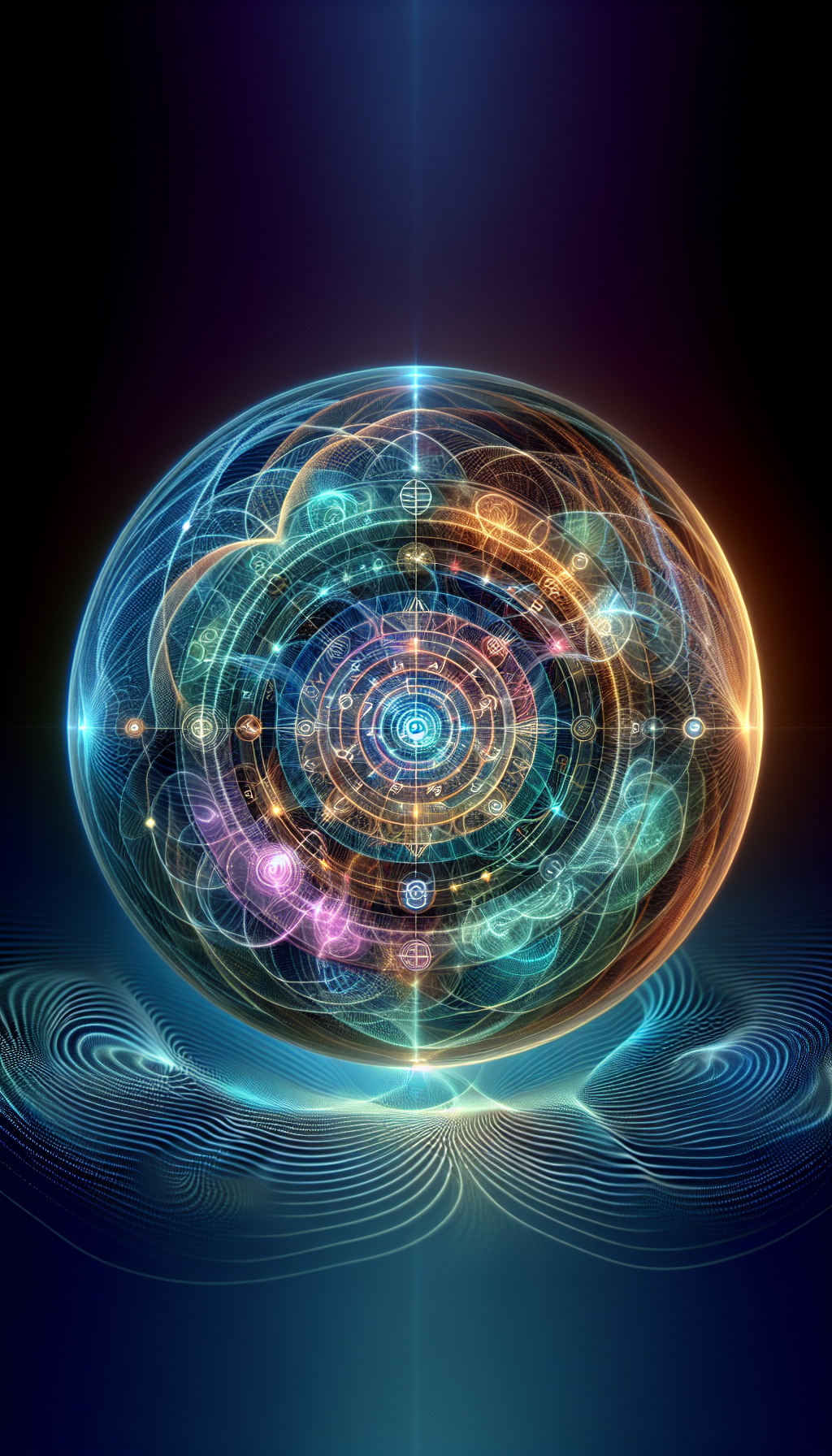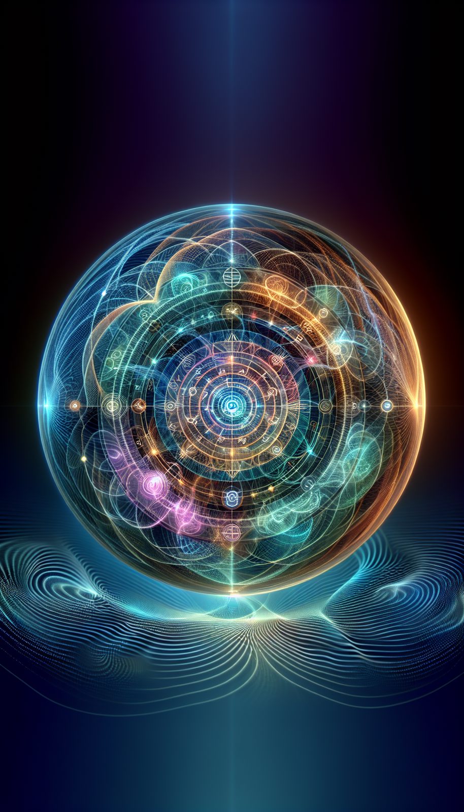 The Unity Codex appears as a luminous spherical construct of layered glyph rings that rotate independently around a central fracture sigil, constantly inscribing and updating universal magical laws in real-time. Its surface shifts fluidly between the color palettes of all ten realms, creating a mesmerizing cascade of elemental hues that pulse in harmony with nearby magical activities. The artifact levitates perpetually, emanating subtle harmonizing frequencies that calm aggressive magical energies and promote cross-realm understanding among wielders.