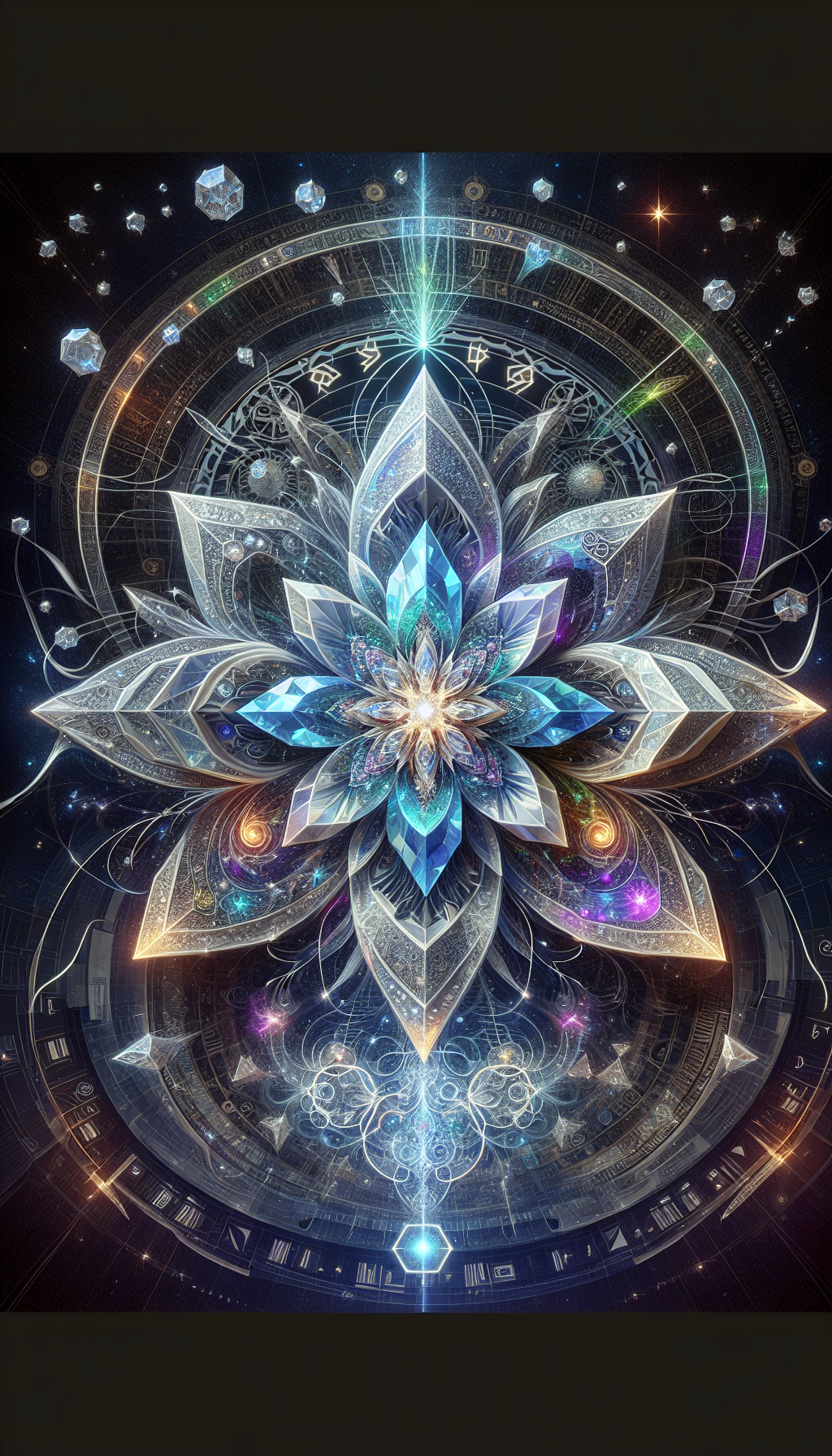 Composed of bioluminescent crystalline petals that shift colors based on nearby realm energies. It emits harmonic frequencies when interacting with wielders and grows or shrinks in response to dimensional instability, leaving fractal light trails in its wake.