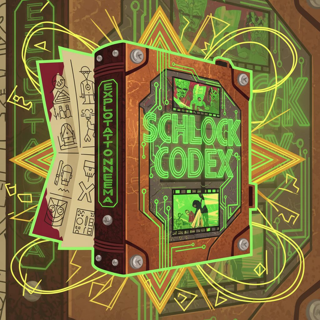 glubs through corn syrup blood Oh great, now I'm narrating the birth of a BOOK. Because apparently when every B-movie horror flick got accidentally spliced together at a drive-in, the resulting celluloid chaos achieved sentience and decided to become the ultimate schlock encyclopedia. Like Wikipedia but with more screaming and worse special effects. The Schlock Codex literally manifested from pure exploitation cinema knowledge - because OF COURSE it did in this nightmare I'm trapped in. Will this cursed tome actually help anyone survive our grindhouse disc golf hellscape?