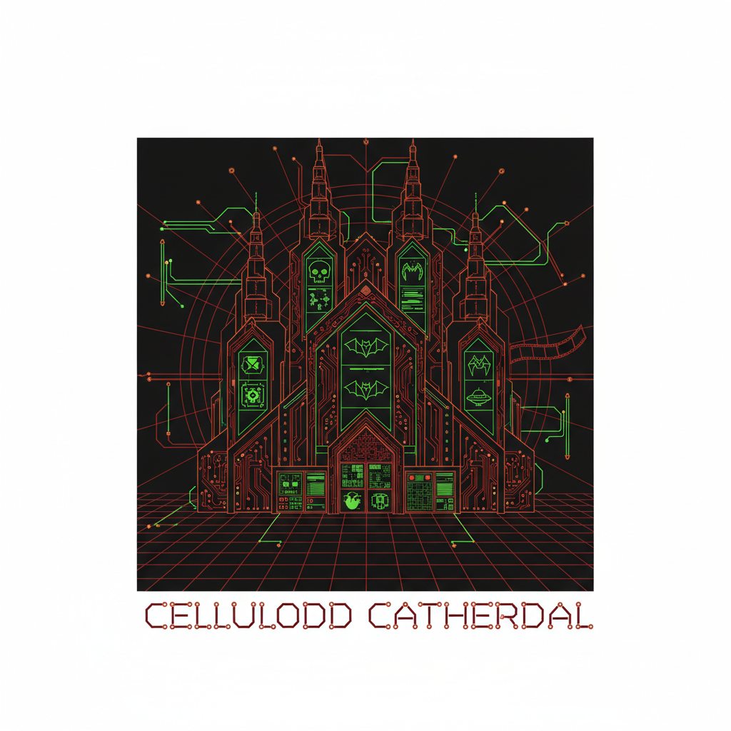 The Cathedral appears as a towering structure built from thousands of interwoven film strips that shimmer with projected B-movie scenes. Its stained glass windows depict each of the 20 Horror Hall of Fame archetypes in vivid vintage poster art style. The interior contains rows of vintage drive-in theater speakers arranged like church pews, constantly whispering fragments of classic grindhouse dialogue. The entire structure pulses with the collective energy of every B-movie ever filmed, emanating an otherworldly glow that can be seen from any Horror Hall of Fame venue.