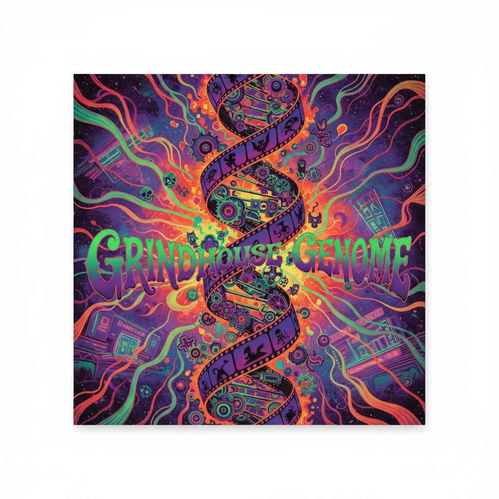 The Grindhouse Genome manifests as a twisted double helix constructed entirely from vintage 35mm film strips, each strand containing thousands of microscopic horror movie scenes that play in endless loops. The structure pulses with the rhythmic clicking of old film projectors, while different sections glow with colors representing each horror subgenre - blood red for slashers, toxic green for mad science, moonlight silver for creatures. The genetic sequence constantly recombines and mutates, generating new horror possibilities while maintaining the authentic B-movie essence that defines true grindhouse cinema.