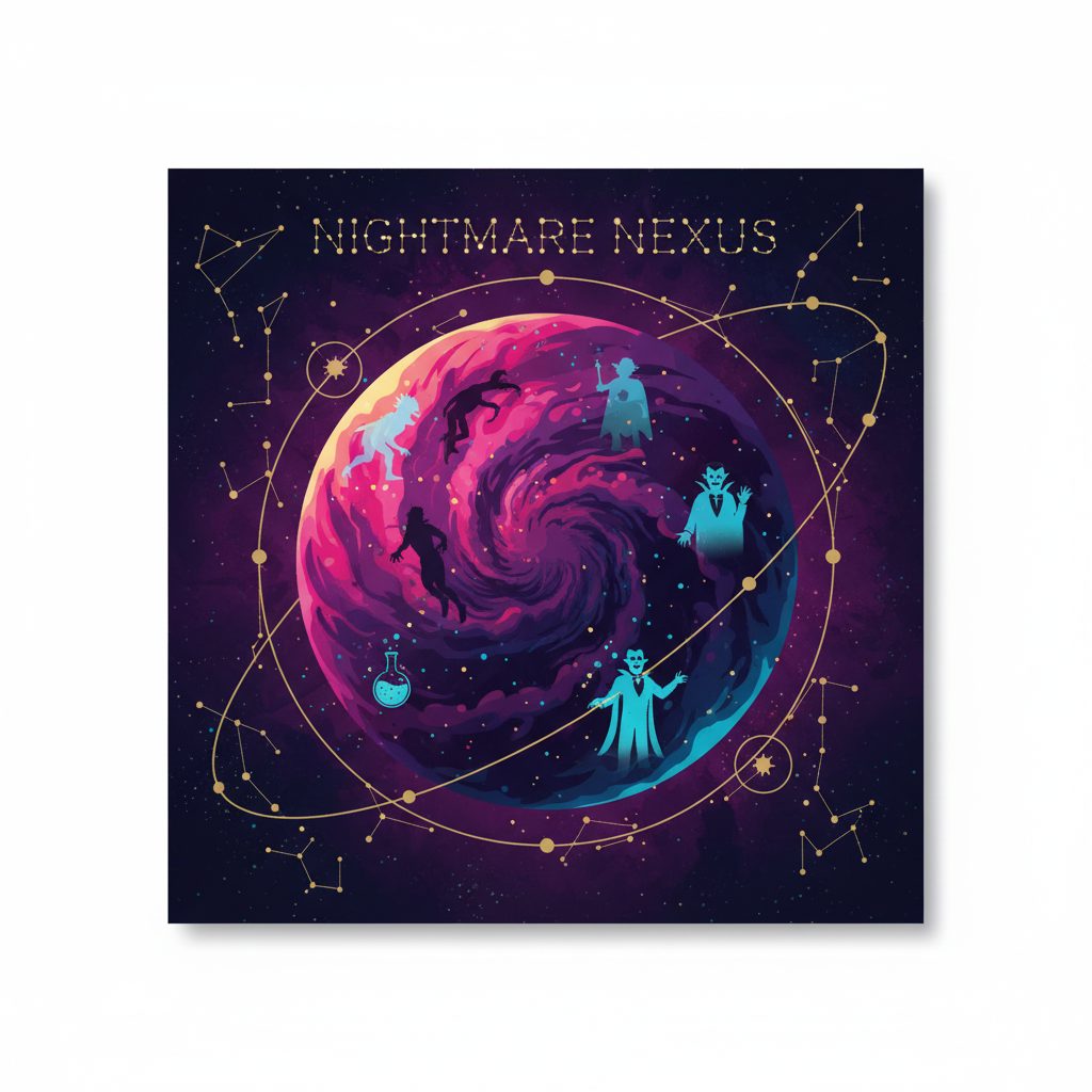 The Nightmare Nexus shimmers with a kaleidoscopic light that cycles through hues matching each league's horror subgenre, from creature-feature greens to vampire-beach reds. It constantly emits a resonant hum layered with distorted snippets of classic B-movie lines and eerie soundscapes. Though intangible, it projects a chilling aura that players sense as a weight of collective nightmare, and it can briefly manifest ghostly images of pivotal series moments to reinforce narrative connections.