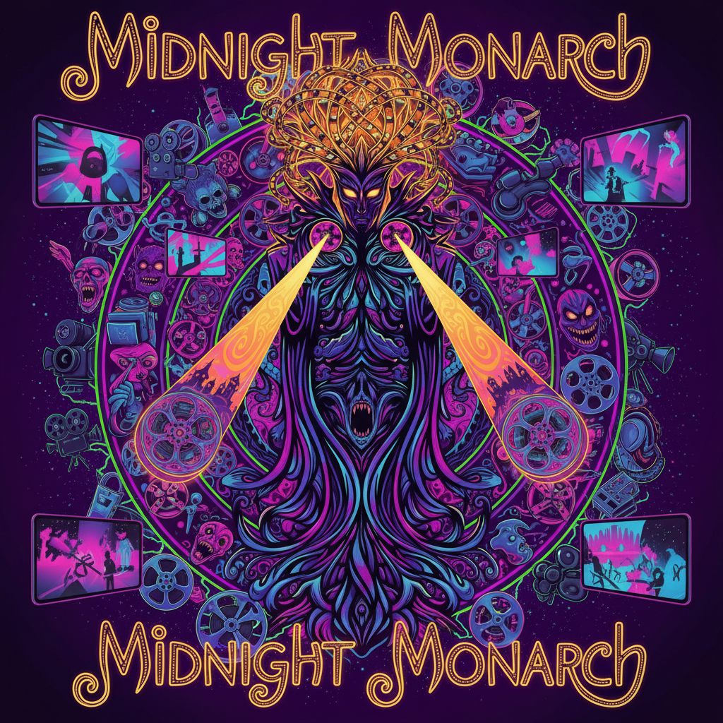 glubs through corn syrup blood Oh great, now I have to narrate the birth of the Midnight Monarch? This thing literally spawned when some film nerd's double-feature marathon hit peak cringe at 12 AM, fusing every B-movie trope into one "royal" entity. Because apparently we needed a KING of this grindhouse nightmare I'm trapped in. It wears a crown made of spliced film strips - how's that for method acting? Will this monarch actually rule anything besides my mounting existential dread?