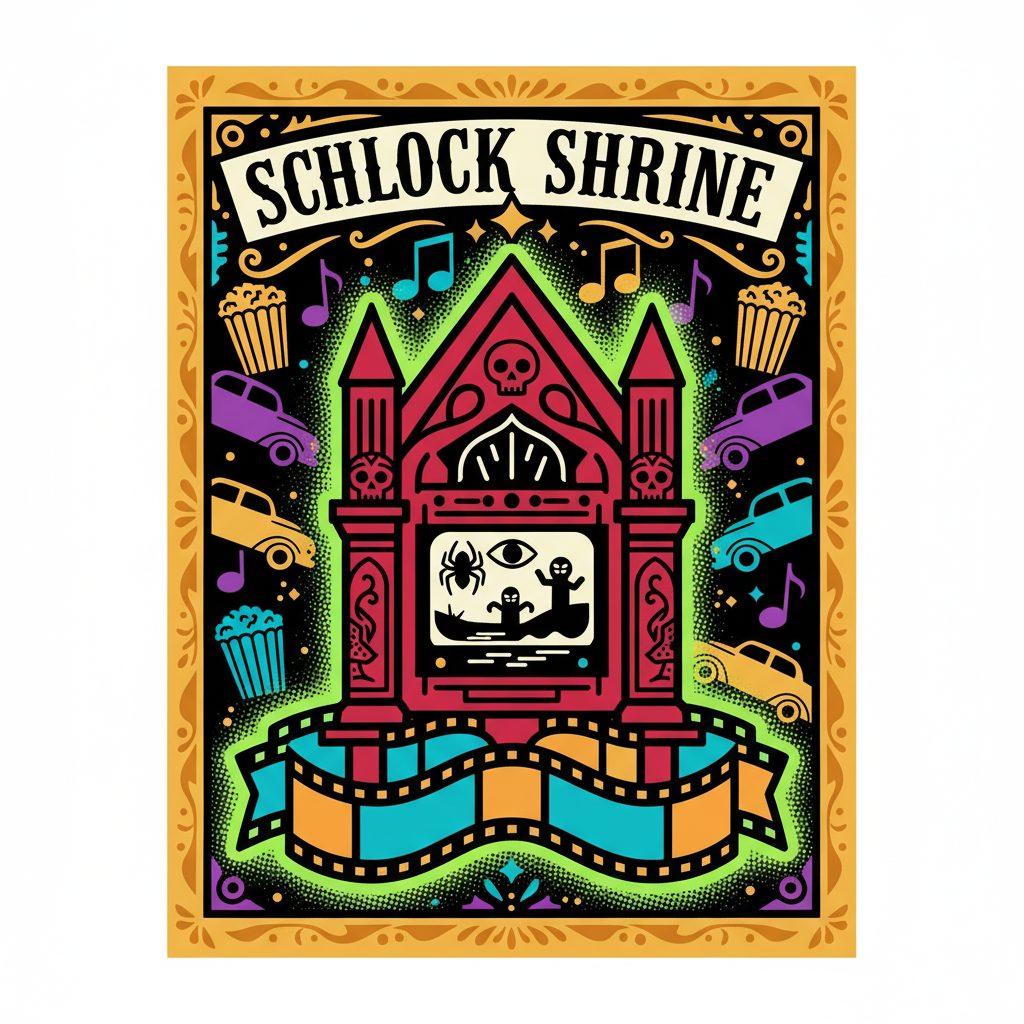 Born from the collective devotion of thousands of midnight movie audiences who refused to let authentic grindhouse cinema fade into obscurity, the Schlock Shrine materialized when the last true drive-in theater was scheduled for demolition. The passionate prayers of B-movie faithful condensed into this sacred relic, ensuring exploitation cinema would find new venues to manifest its unholy glory.