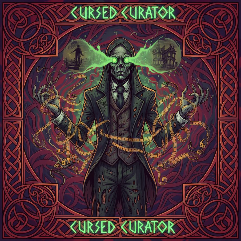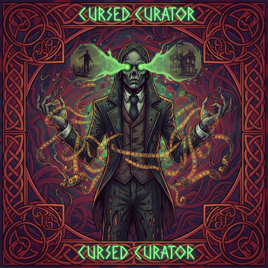 The Cursed Curator emerged from the first cursed film reel ever screened at a grindhouse theater, born from the collective dread of forgotten B-movie horrors to ensure no cursed narrative is ever lost.