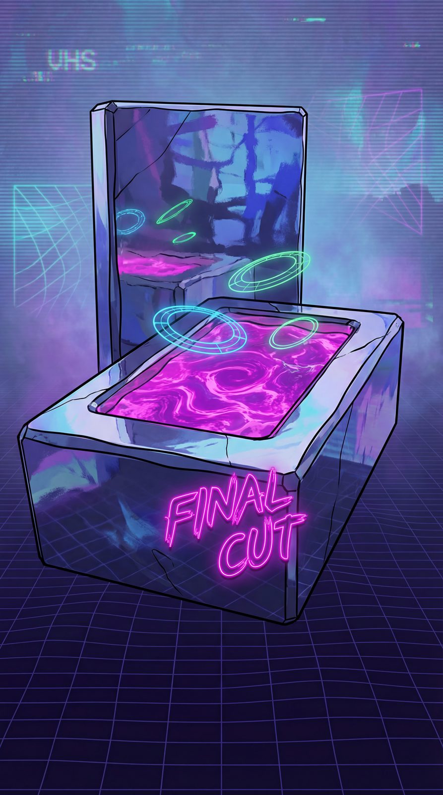 It emits a soft, audible click-whirr reminiscent of a film splicer. Its surface features a scrolling neon line like an editing timeline, and it subtly warps the neon grid lines of the VaporGrid around it, suggesting it 'cuts' reality. Miniature, ghostly holograms of perfect throws from across the series flicker above it momentarily.