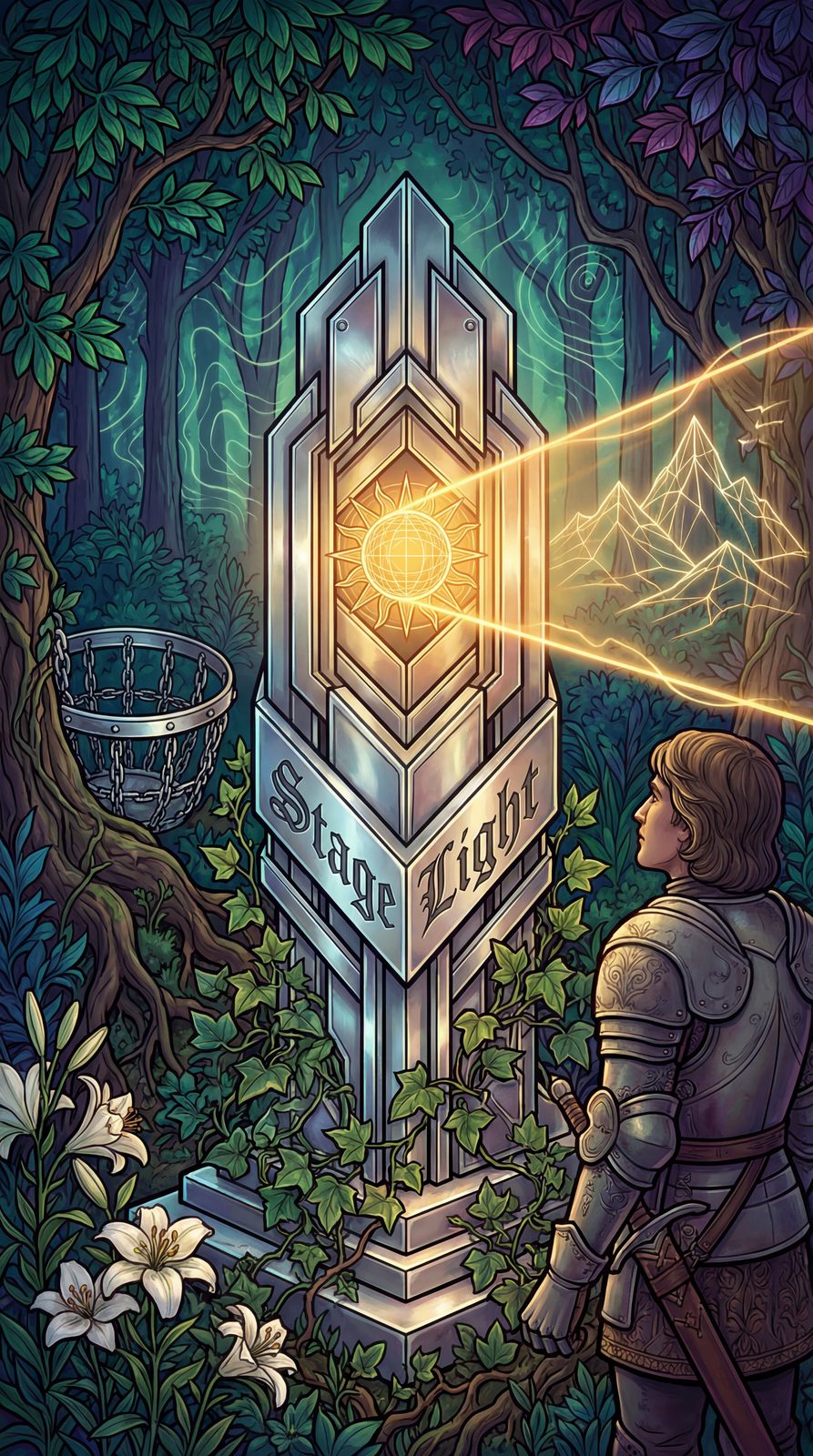 Emits a beam of adjustable light from warm to cool white, with pulsating neon accents. The beam pulses in sync with rising dramatic tension or a player's heartbeat. Most uniquely, the light can subtly bend and warp to trace the ideal flight line for a disc, serving as a luminous guidewire through complex fairways.