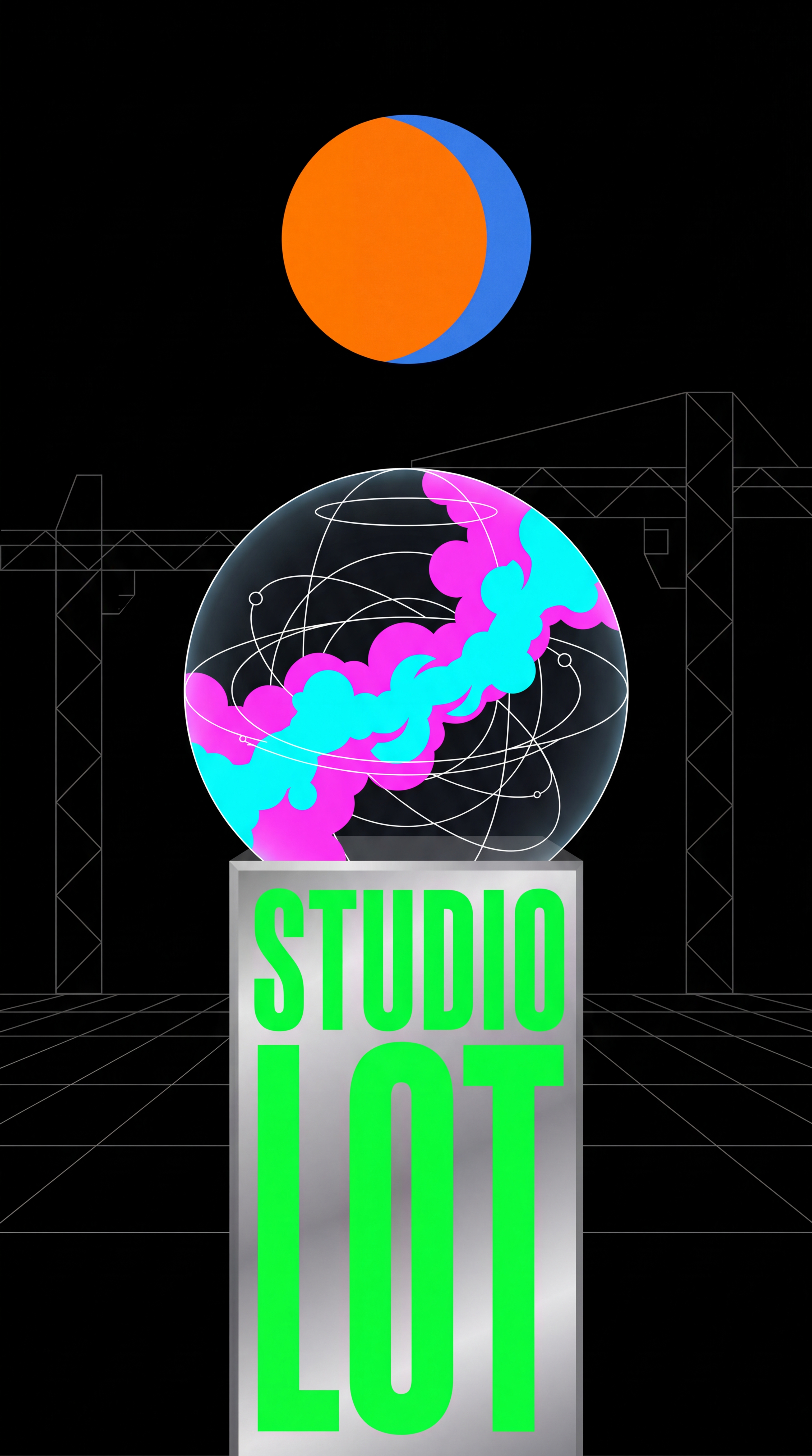 The Lot's geography is malleable, shifting its aesthetic based on proximity to active league 'sets.' The sky is the series' geometric sun/moon cycle, framed by massive, faint wireframe gantries of the Lot's superstructure. Ambient sound is a collage of distant film production noises from adjacent sets. Central landmarks maintain a neutral VaporGrid aesthetic of wireframe grids and flat neon colors.