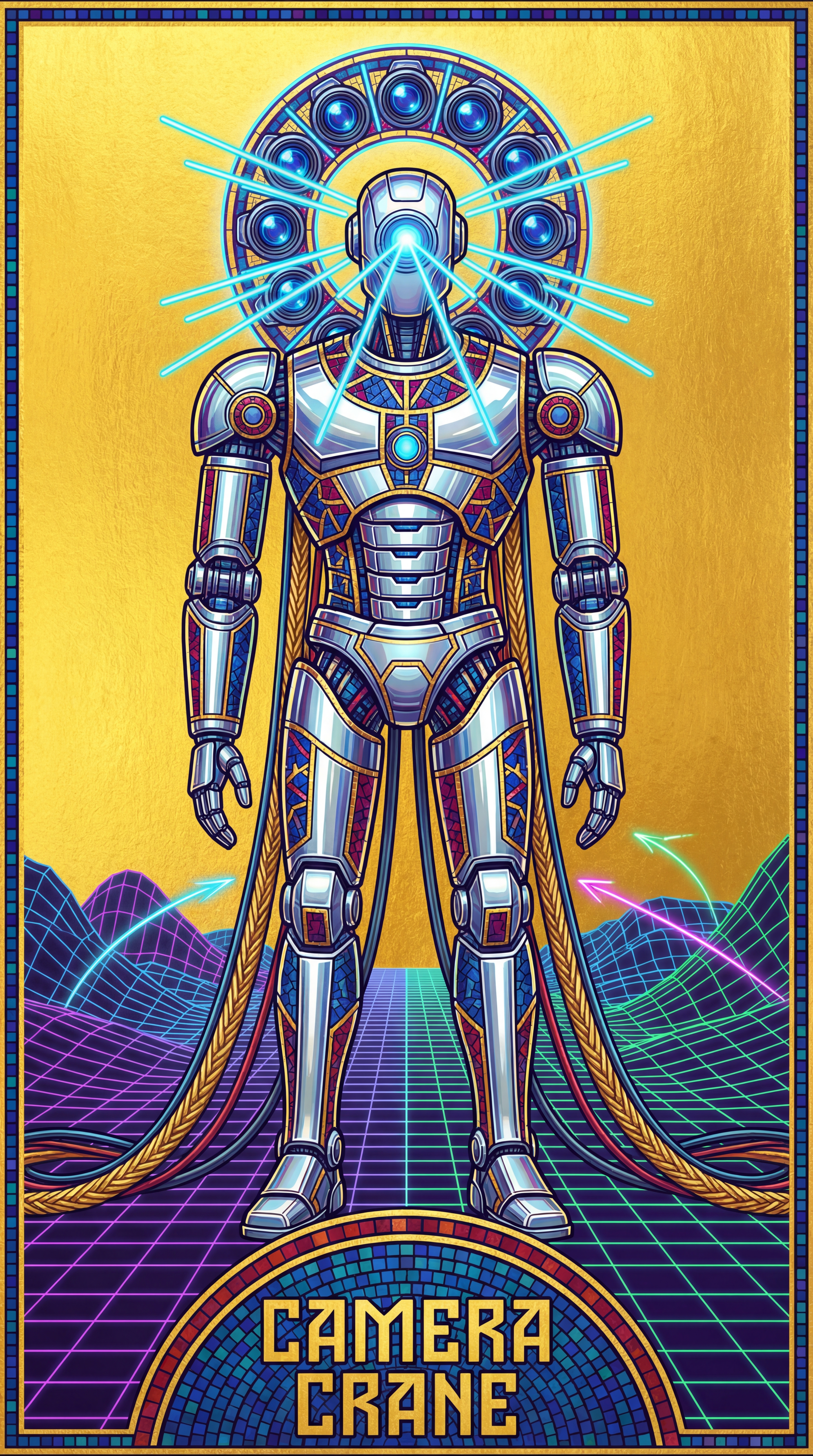 Born from the accidental fusion of a camera dolly and a construction crane on the set of an 80s blockbuster, the Camera Crane gained sentience within the VaporGrid and now roams the wireframe landscapes to frame epic disc golf moments.