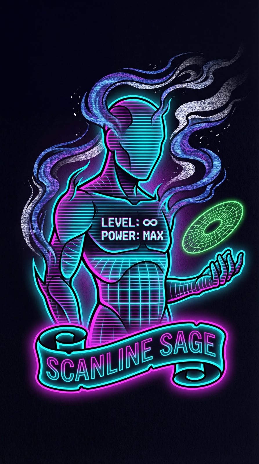 The Sage manifests as a humanoid silhouette composed of oscillating horizontal video scanlines that hum with the buzz of a VCR. It can momentarily freeze into a single, sharp frame from a past event, revealing critical data. Its presence causes nearby neon elements in the VaporGrid to pulse in rhythm with its form.