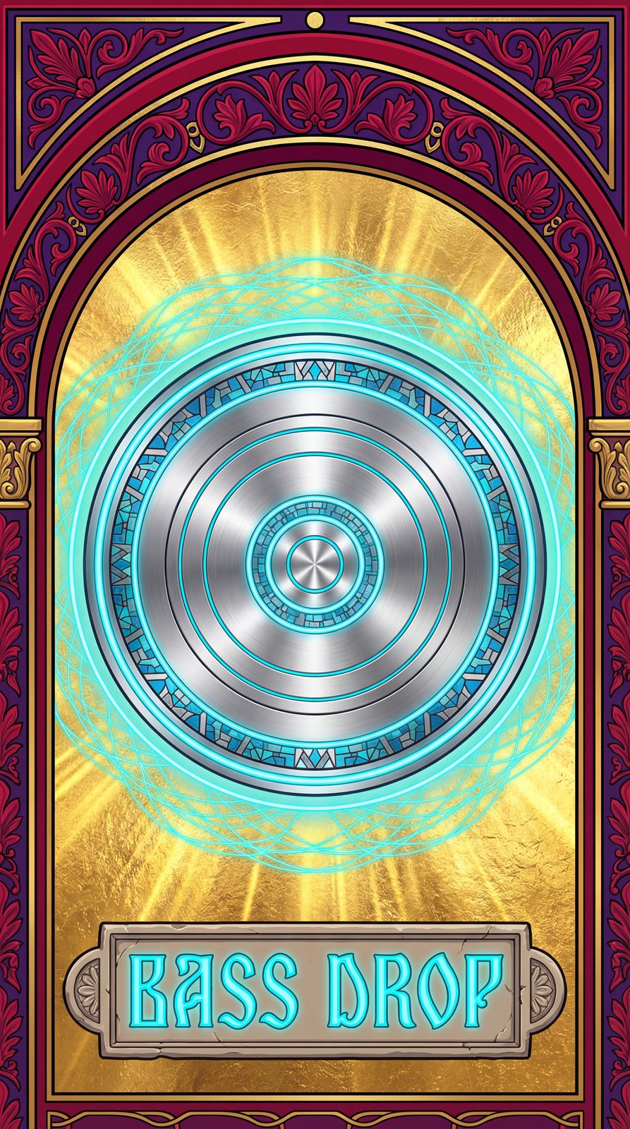 The Bass Drop is a chrome-plated disc that vibrates with a deep, subsonic frequency felt in the bones before it's heard. It emits a slow, concentric pulse of neon cyan light that warps the surrounding wireframe grids and neon tracers as it expands. Its surface does not reflect light, but instead displays faint, swirling visualizations of the audio waveforms from iconic 80s film scores.